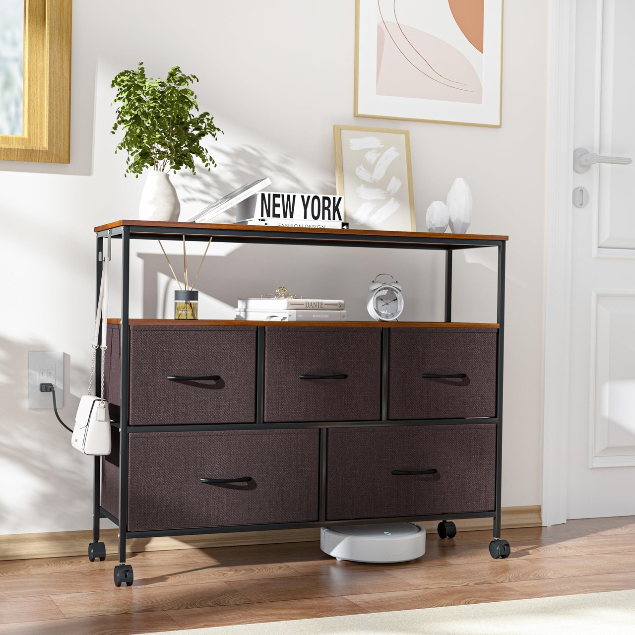 【在庫セール】チェスト タンス 幅100奥行30高さ78㎝ 収納チェスト 収納ケース コンセント2口付き ストッパ-キャスター付き 移動式と固定式2機能 テレビ台としても使える 頑丈 組立簡単 耐震転倒防止 大容量収納 引き出し2段5杯 棚板2枚(ダークブラウン)