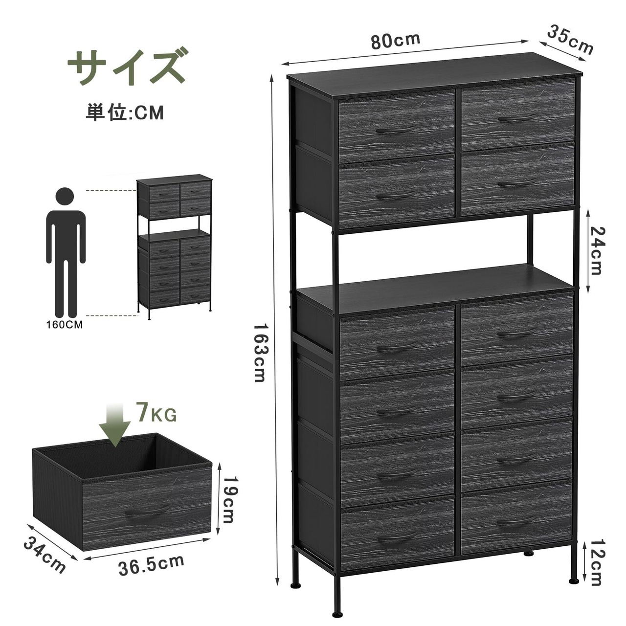 「12杯引き出し大容量の収納力」12杯の引き出しにより、たっぷりと収納できるため、衣類や小物、書類などさまざまなアイテムを整理整頓するのが簡単です。使い勝手も抜群です。日常生活で必要なものをしっかりと収納できます。