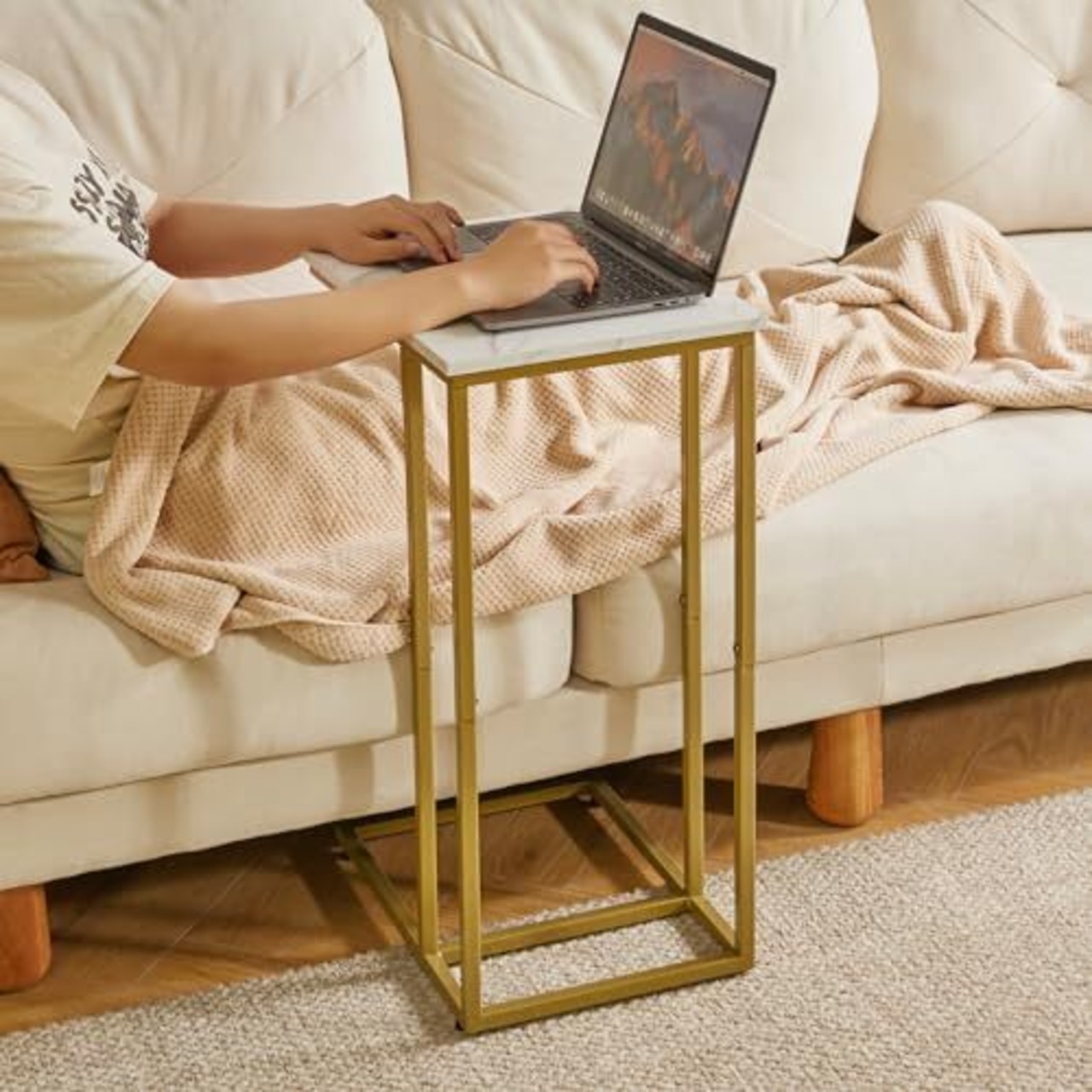 【特価商品】サイドテーブル ソファーやベッド横で使いやすい 差し込み式 隙間テーブル コの字 簡易テーブル 小さい置きテーブル 耐荷重20kg 40*30*64cm 白い大理石模様天板+金色脚 YD-TM051G