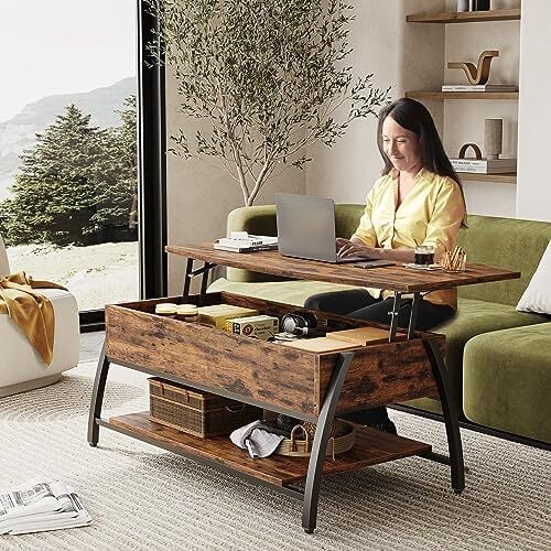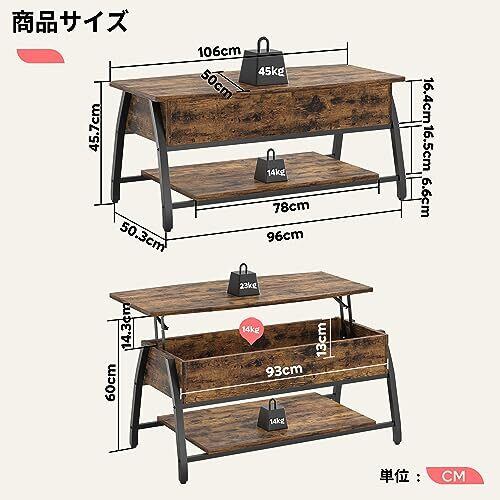 ローテーブル 昇降式 センターテーブル 幅106 リフティングテーブル 収納棚付き 隠す収納 おしゃれ 幅106×奥行50×高さ45.7-60cm リビングテーブル 収納テーブル 在宅勤務 食事 (木製シェルフ収納・ブラウン)