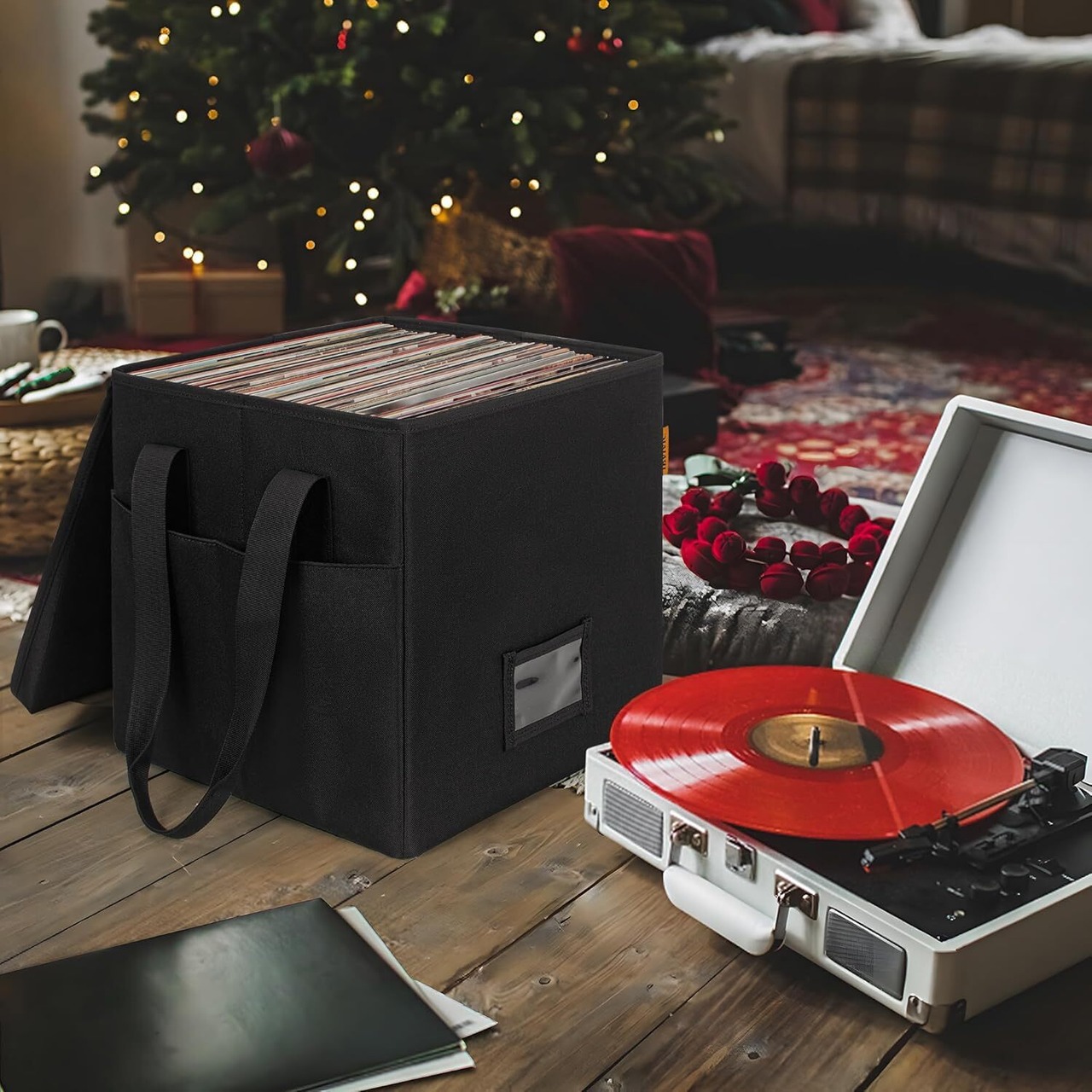 BQKOZFIN レコードケース ビニールレコード保管ボックス 長さ34.5 x 幅34 x 高い34cm 12インチ LPレコード用収納ボックス蓋付き LP盤約70枚収納可能 防塵 (ブラック)