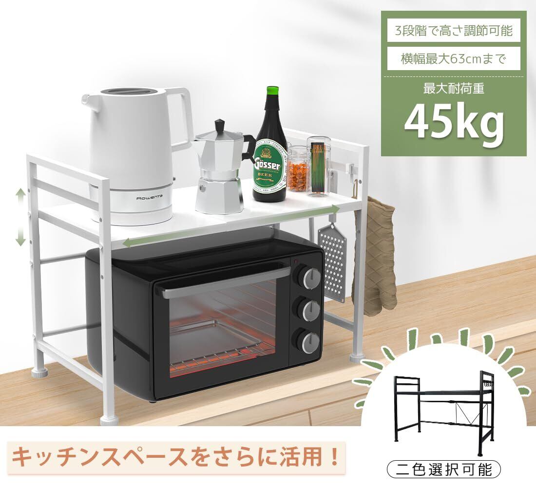 【伸縮設計でスペースを有効活用】:可動棚板は約5.5cm間隔で3段階で高さ調節可能で、約幅40cm~63 cm(内寸)で無段階調整できます。自分の好みに合わせて自由にアレンジできます。電子レンジだけでなく、ジューサーや湯沸かし器などの小型家電にも応用できます。1つの製品でキッチンの空間が整頓され、レンジの大きさや収納物の量、置く場所の広さなどに合わせたご家庭のキッチンにちょうどいい形で設置していただけます!