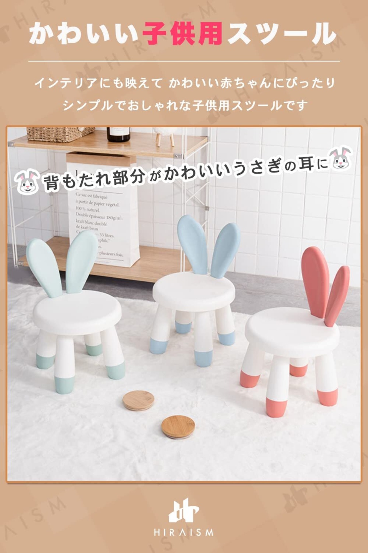 【おしゃれでかわいい子供用スツール】背もたれ部分がかわいいうさぎの耳になっている子供用ダイニングチェア(豆椅子)。インテリアにも映えて、かわいい赤ちゃんにぴったりのシンプルでおしゃれなデザインです。