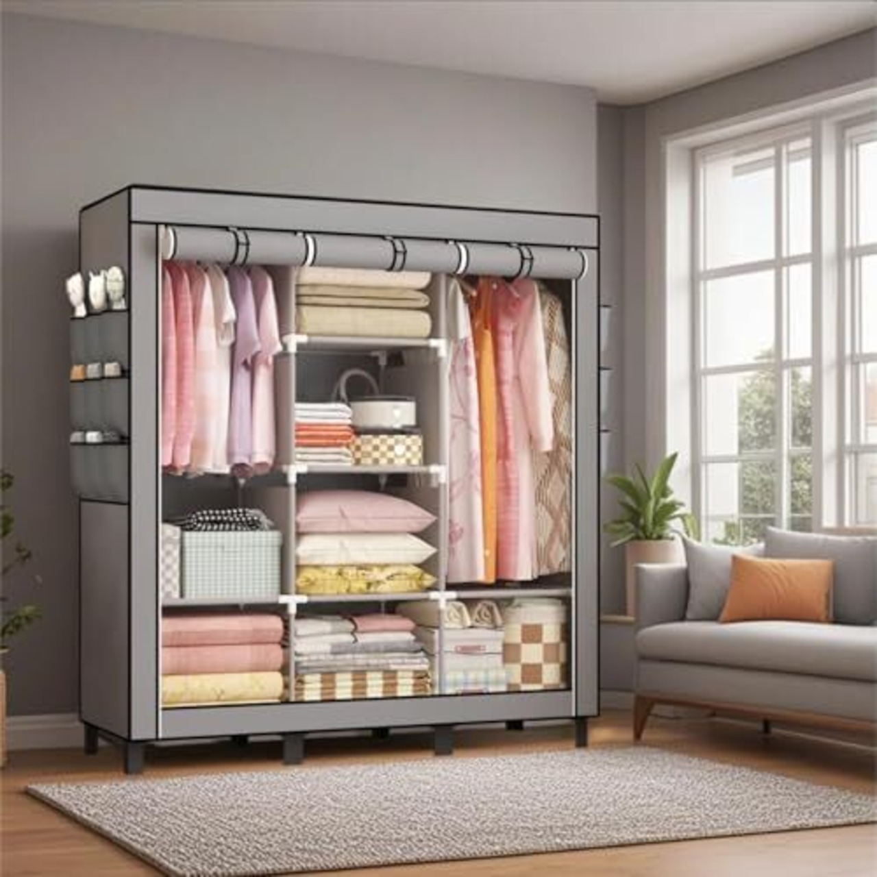 【大容量 & 多機能なクローゼット 収納】当社のワードローブは、本格的なクローゼットと同等の大容量を備えながら、ハンガーラック カバー付きの軽量デザインを採用。内部には 2 つの 120cm 超長ハンギングエリアを設置し、ロングコートやワンピースドレスをシワなく吊るすほか、6 層のプラスチック置物棚で布団・靴・バッグを整然と収納。側面の 18 個のポケットは小物やファンシーケースの分類に最適化され、天板には旅行用スーツケースを置ける広さを確保して、空間を最大限に活用したクローゼット 収納を実現します