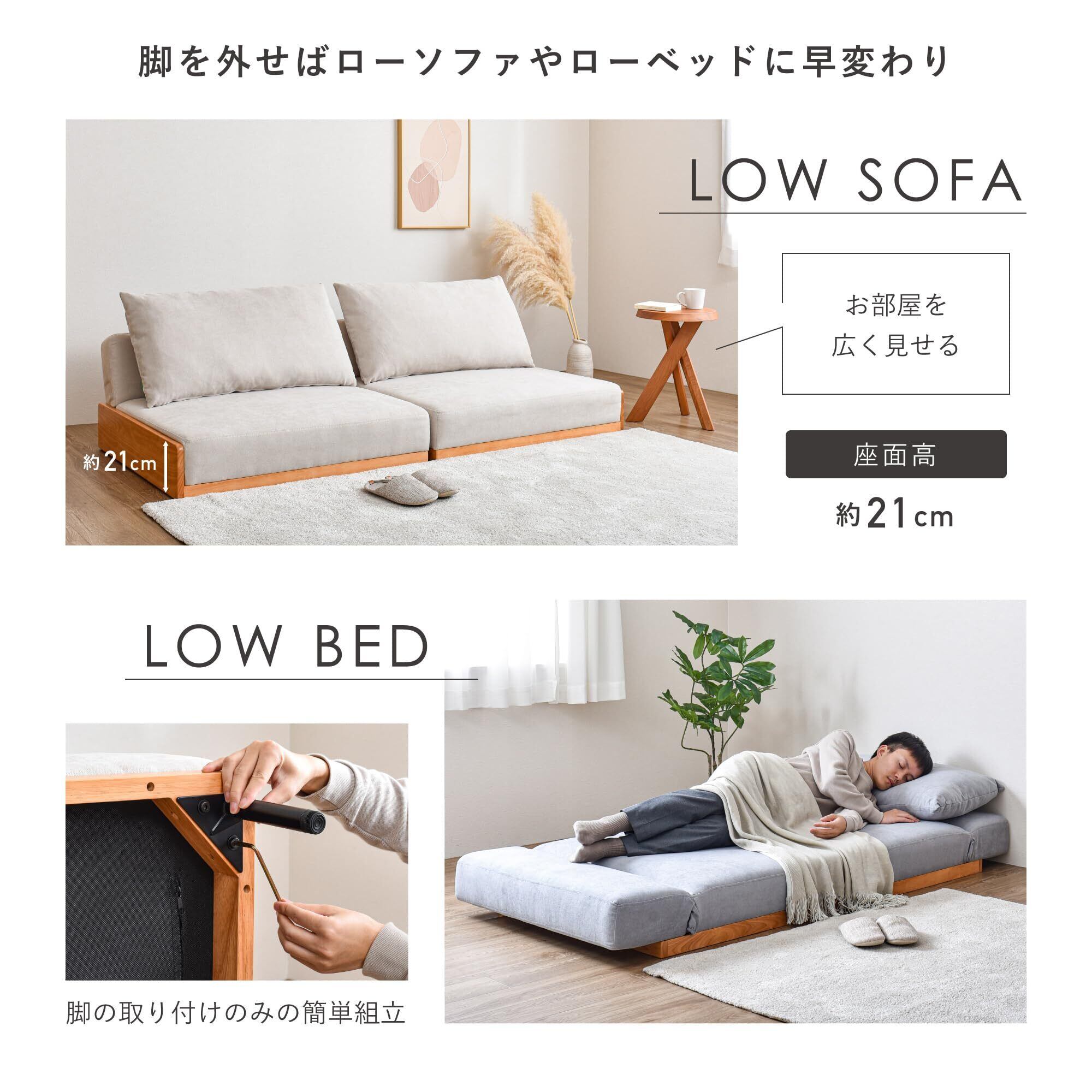 【深く沈み込まない弾力感でしっかりと身体を支える】座面部はほど良い固さで、しっかりとした座り心地がお好みの方におすすめです。座面高は立ち座りがしやすい高さで、身体をしっかりと包み込む背面クッション付きです。お昼寝や読書などに最適でおうち時間をお楽しみいただけます。【脚を外せばローソファやローベッドに早変わり】座面の低いロータイプソファにすれば、お部屋の空間に余裕が生まれお部屋がすっきりとした印象に。また、背もたれを倒してローベッドとしても使用いただけます。※この商品はセパレートタイプのため、ソファ同士のズレが発生する場合がございます。予めご了承ください。