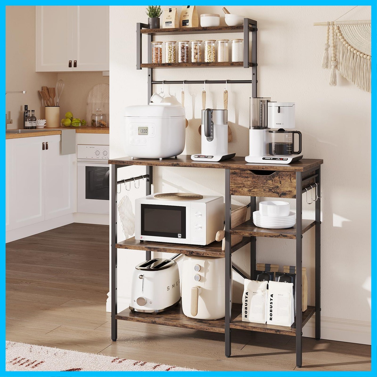 【キッチン収納を極めた主役級のレンジラック】台所収納の補助として、キッチンカウンターのストレス解消し、効率的でスッキリな空間を作り出すこのレンジラック。8つの収納スペースを巧みに活用し、上段の2つの棚は、調味料やスパイス瓶を並べ、簡単に取り出せるように実現。広々とした天板(幅90cm)には、コーヒーメーカーやトースターなど、毎日使う家電をスタイリッシュに並べて、さらに洗練された印象に仕上げます。引き出しとオープン収納を組み合わせたデザインで、アイテムをすぐに見つけられ、使い勝手も抜群です。Bestierキッチンボードで使いやすく・戻しやすい・乱雑にならないキッチンを。