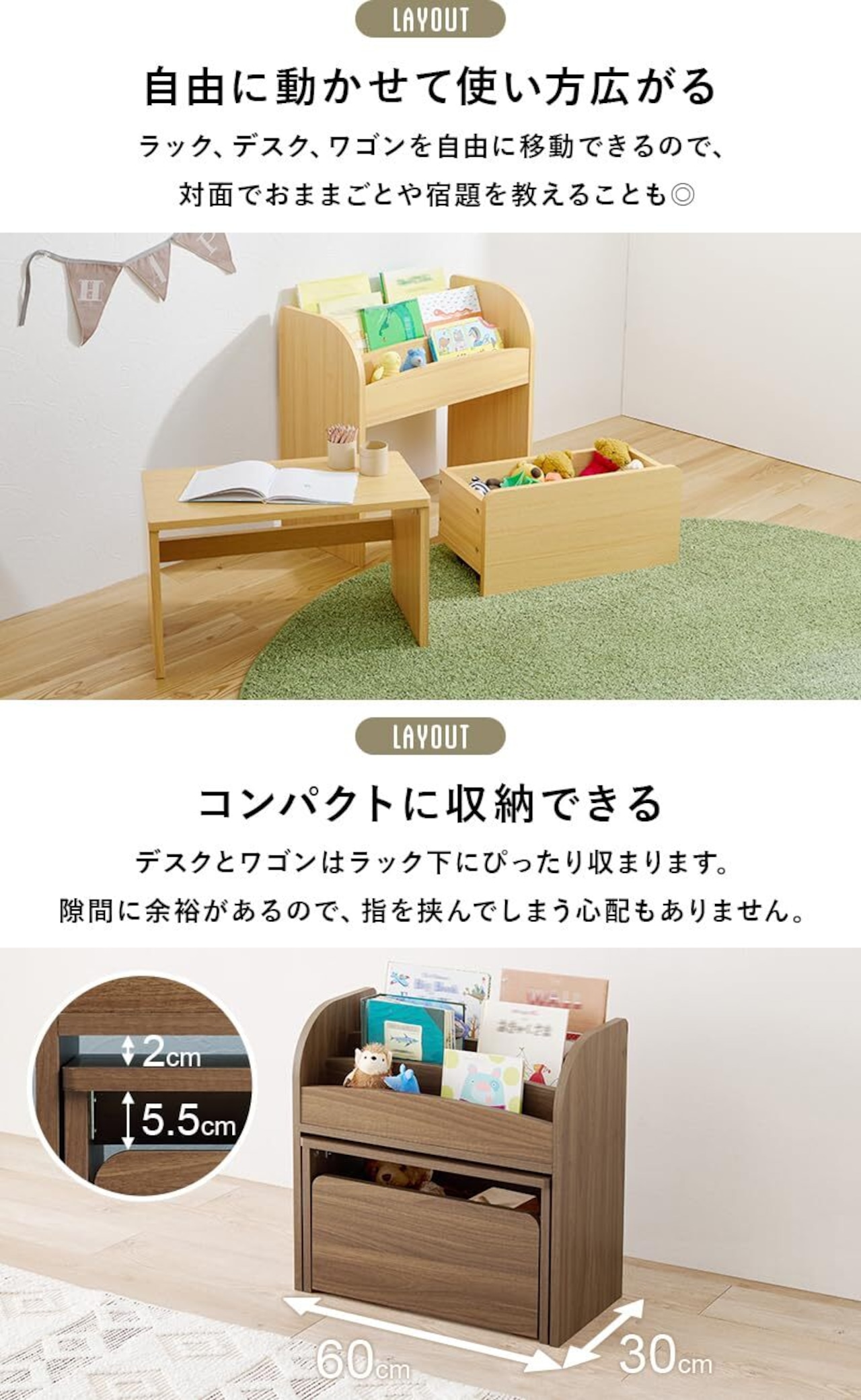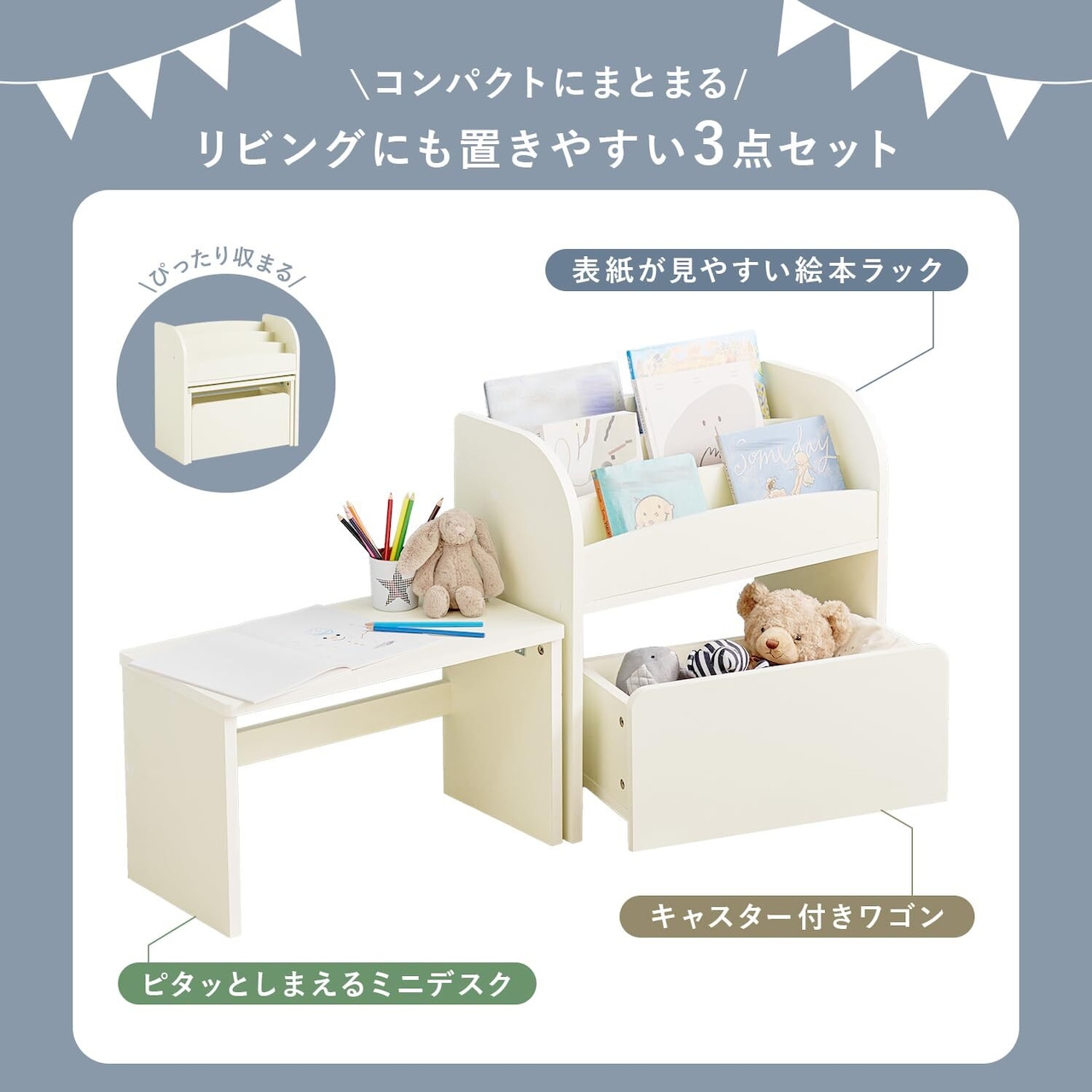 コンパクトにまとまり、リビングにも置きやすい絵本ラック・キャスター付きワゴン・ミニデスクの3点セット。