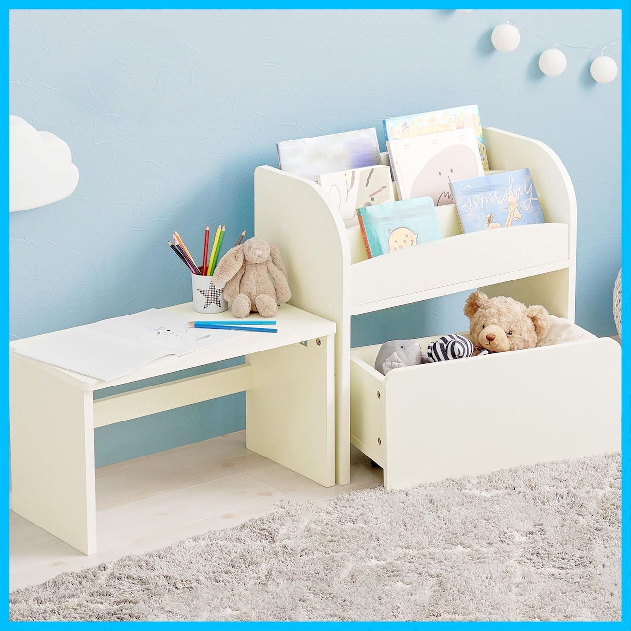 【数量限定】萩原 キッズデスク 子供用 デスクセット 3点セット 【 絵本ラック ミニデスク キャスター付き ワゴン 】 学習机 コンパクト シンプル ホワイト RCC-1609WH