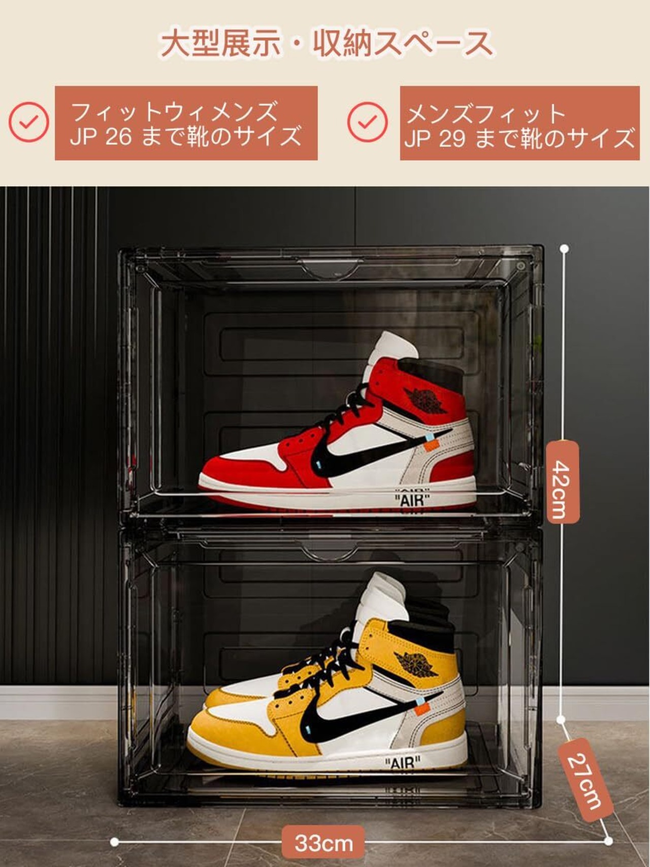 【大型展示・コスパよし】ディスプレイシューズボックスのサイズはメンズJP29までに適用、330mm(L) x 270mm(W) x 210mm(H)です。コスパよしの横型展示、お気に入りのトレーナーやヒールはもちろん、ブーツ、フラットシューズ、サンダル、スリッパも紹介できます。