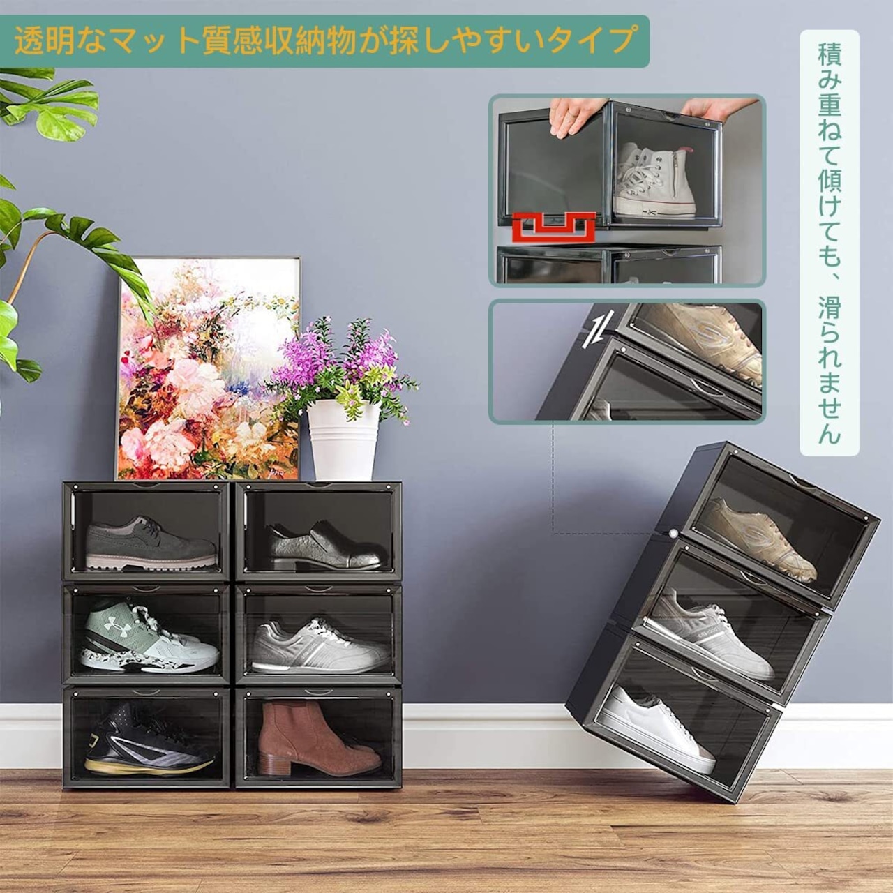【多用途、積み重ねて省スペース】シューズボックスは上下の積み重ねが結合されるスロット連動設計で、傾けても落ちません。十分な耐荷重なのも嬉しいポイントです。シューズに限らず、服や事務用品、化粧品、小物の収納も楽々です。省スペース設計により室内だけでなく、玄関、ベッド下など狭い空間が利用できます。
