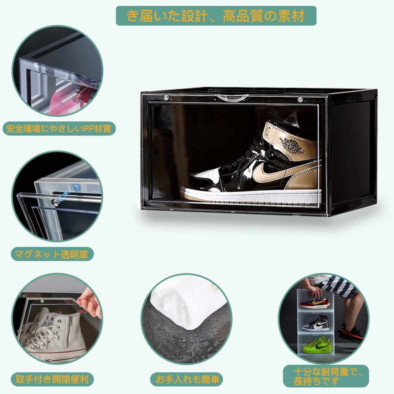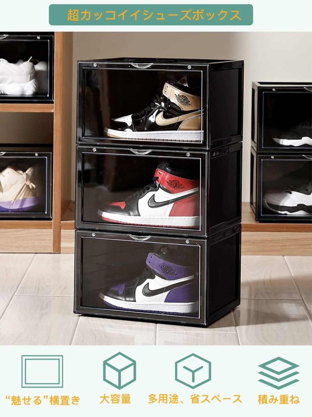 【超カッコイイディスプレイ】横に置くデザインで、靴の横顔は一目然です、ディスプレイ感覚で並べることができます。自慢のシューズ、有名ブランドのコレクション、限定シューズなどをおしゃれに収納できます。サイズ長36cm×横幅28cm×高さ22cm、サイズJP30までのスニーカーを簡単に収納できます。