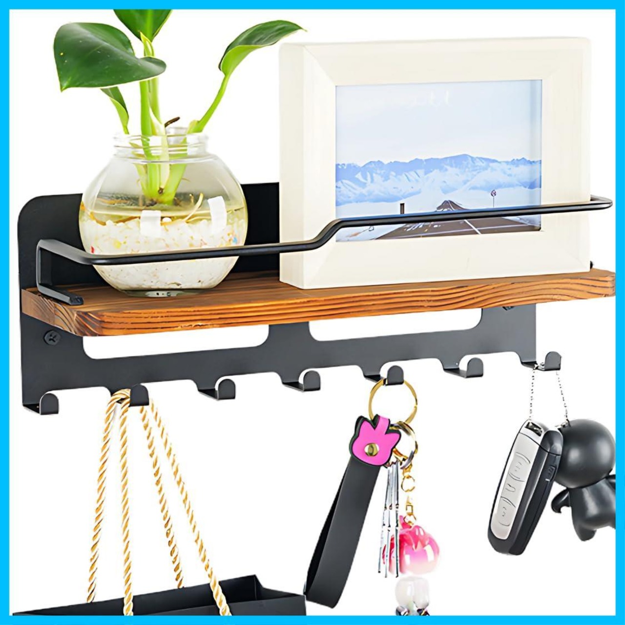 【人気商品】ウォールシェルフ 7連フック ウォールハンガー 壁 収納 落下防止フレーム ウッド ネジ固定 WS3 (1個)