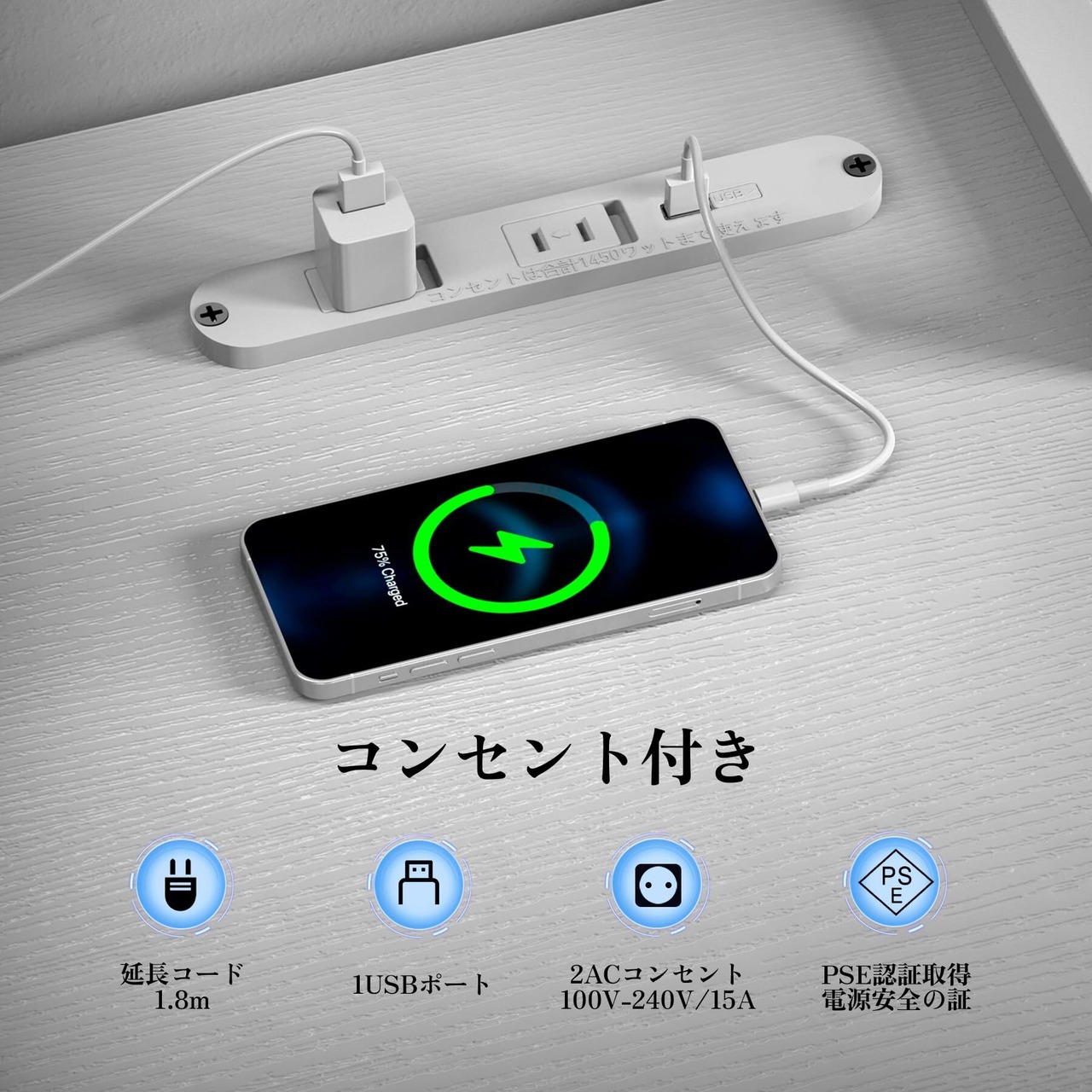【内蔵電源コンセント】パソコンデスクの上にはACコンセント2口とUSB充電ポート1口が搭載され、電源供給に便利のともに、配線もスッキリとまとめられ、より快適な感じをもたらします。