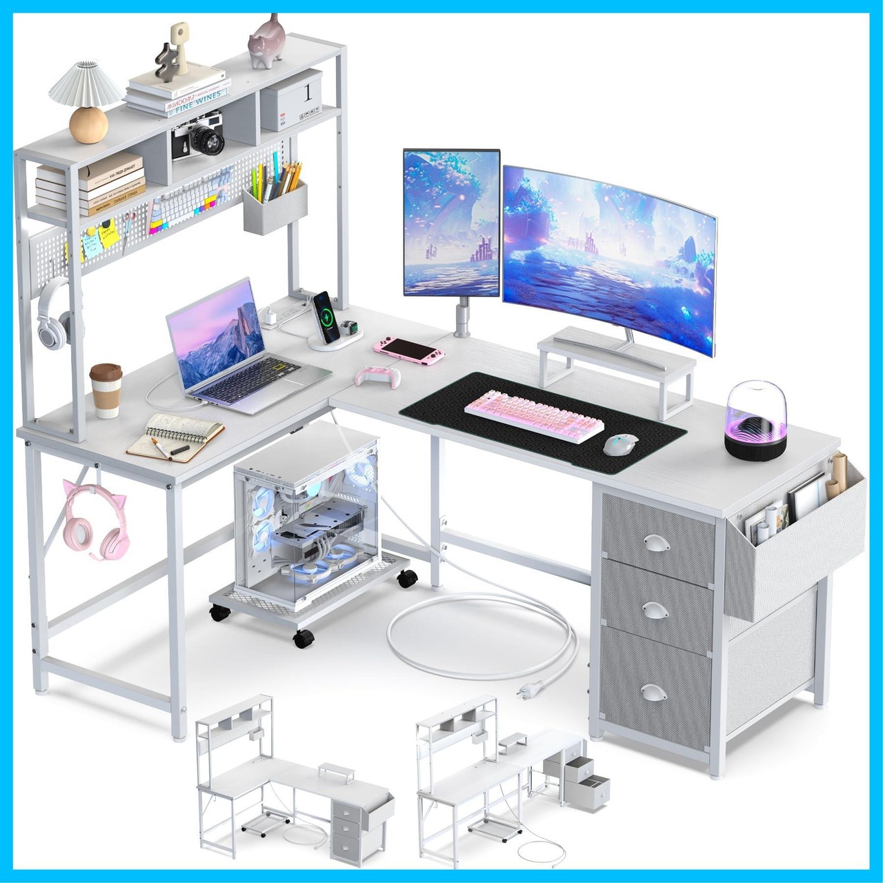 L字デスク パソコンデスク 白 幅169cm 引き出し/有孔ボード/コンセント付き 棚 収納 ゲーミングデスク PC ですく computer desk 桌子 オフィス用 学習机 作業机 コーナーデスク 在宅勤務 組立簡単 (ホワイト, 幅169CM)