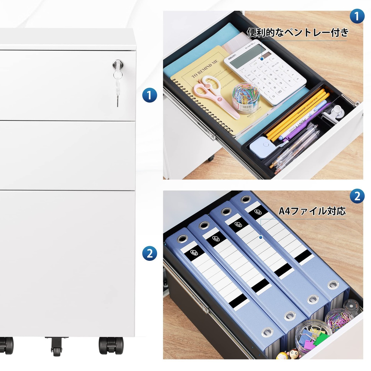 スリムワゴン デスクワゴン サイドワゴン オフィスワゴン キャビネット 幅300*奥行435*高さ600mm スリム型 コンパクトサイズ キャスター付き 鍵付き 3段オールロック A4対応 丈夫なスチール製 サビ止め塗装 ホワイト