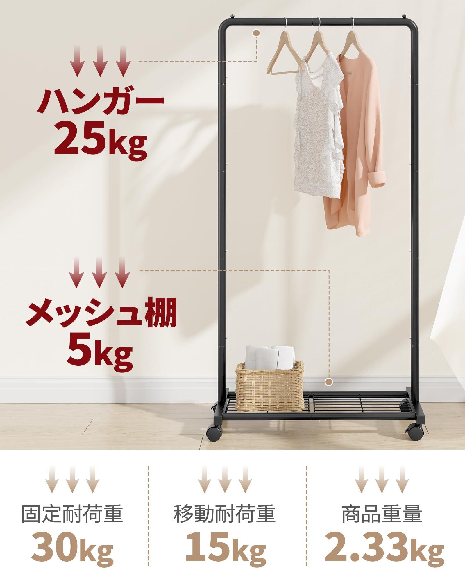 頑丈な構造:Sakugiのラックは、高品質な金属を使用し、強力なコートハンガーとして設計されています。最大30kgまでの重量に耐え、最大33着の衣類を収納できます。このハンガーラックは耐久性に優れており、長期間の使用にも適しています。すべての洋服の吊るし収納ニーズに応えます。