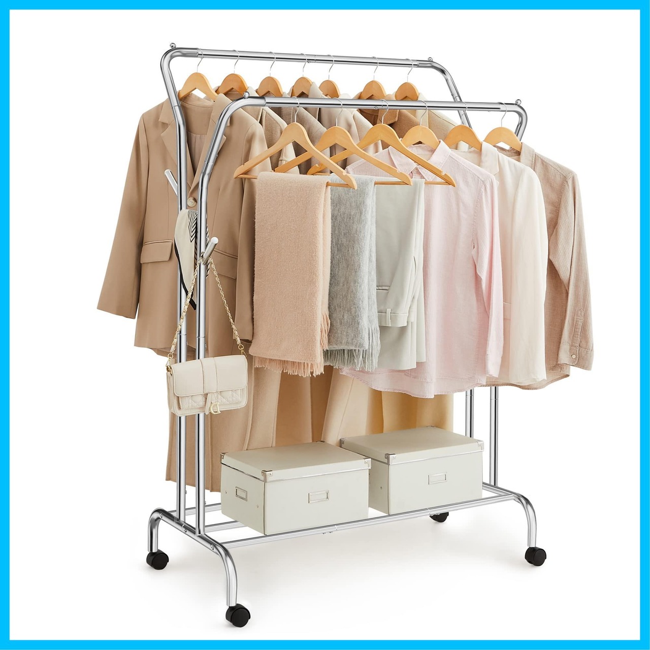 SONGMICS ハンガーラック 2段 頑丈 衣装ラック 洋服・コード掛けパイプハンガー 棚、キャスター付き 幅103.5cm 衣類収納 安定性 移動しやすい ちょうどいいサイズ 室内物干し シルバー HSR107E01V1