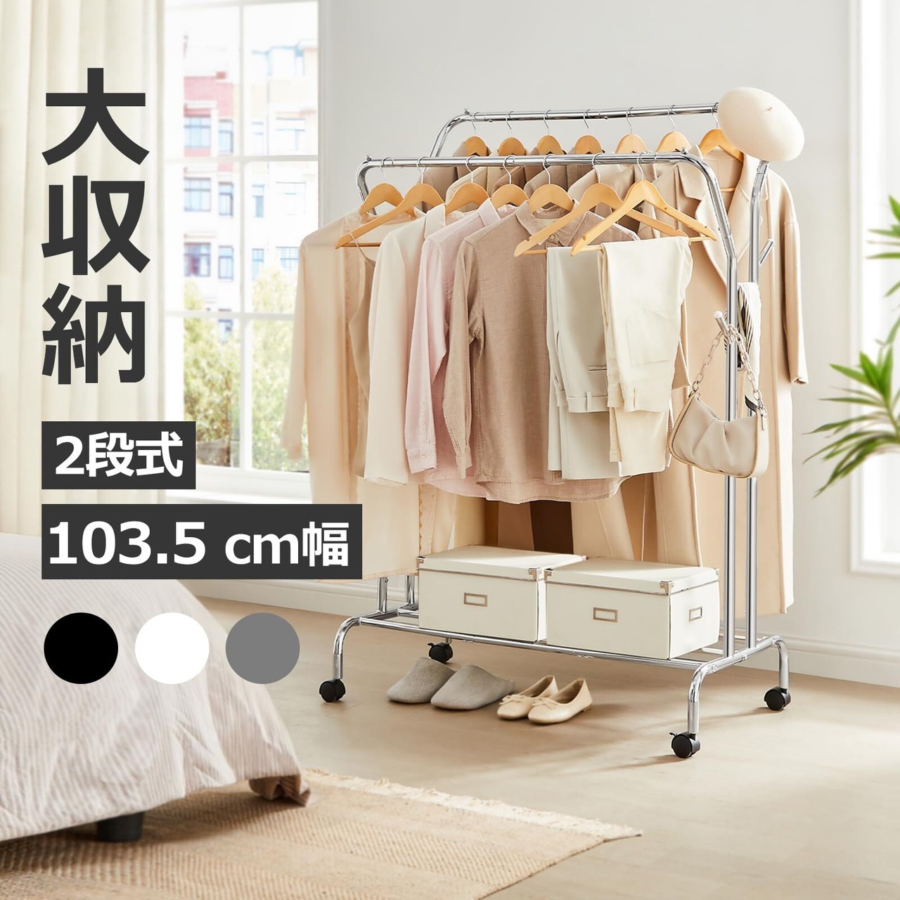 【抜群の収納力】幅103.5cmと前後2本のポールで収納力がアップされて、沢山の洋服、カバン等を掛けられます。底部棚板の設計、帽子、アクセサリー類、シューズラック、収納ボックス等を置いてお使い頂くことが可能です