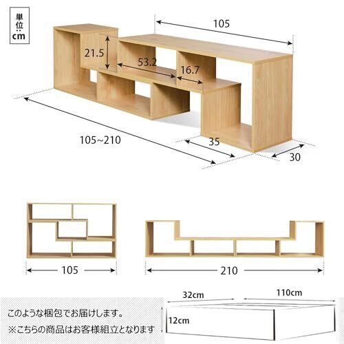 「商品仕様」テレビ台サイズ:幅105×奥行29.6×高さ43cm。伸縮幅:105~210cm。最大60インチのテレビまで対応可能。本体重量:19.5kg。梱包重量:20.3KG。耐荷重:25kg。ボード厚さ:15mm。素材:高級合成樹脂強化合板。
