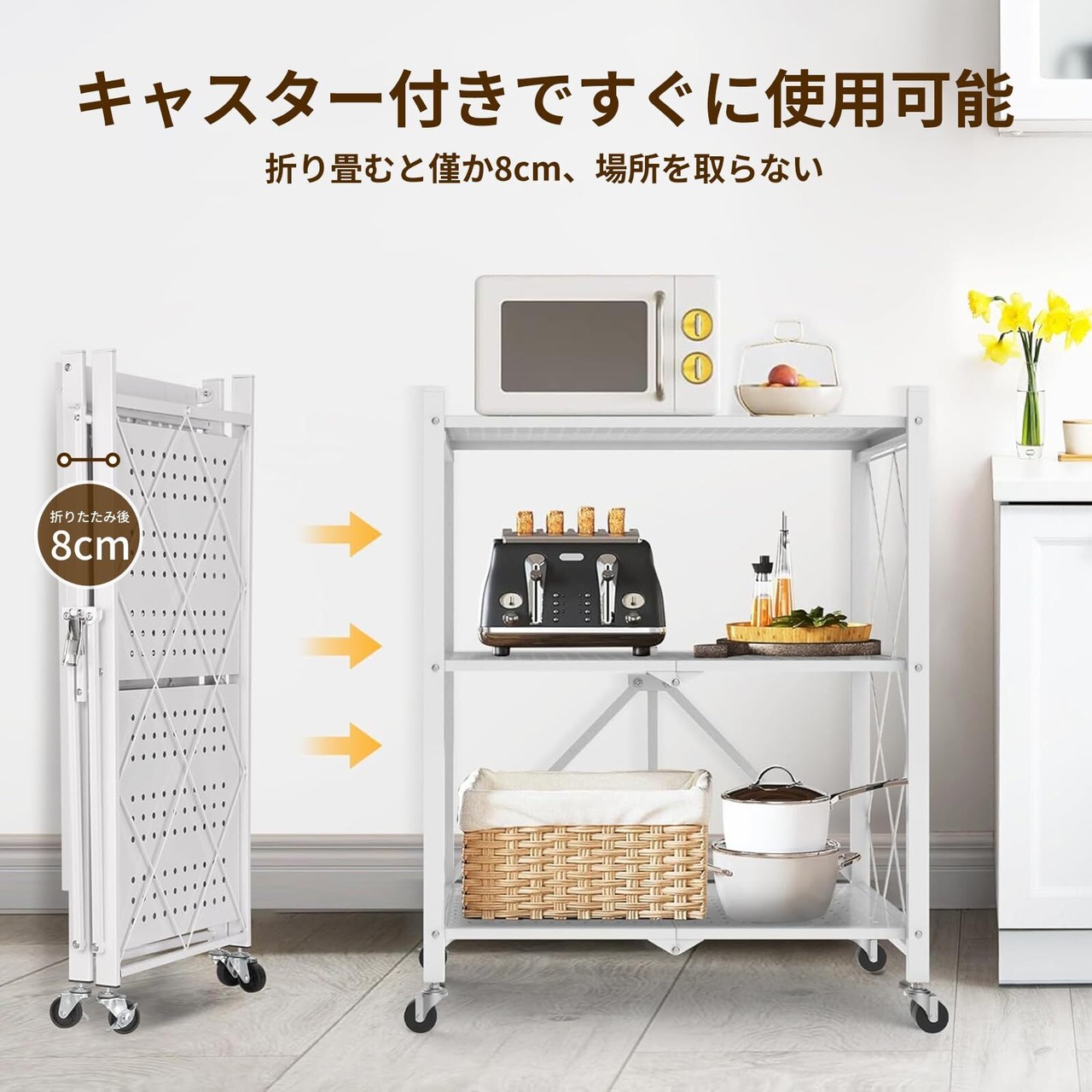 【多機能デザイン】この折りたたみラックは多層デザインで、キッチン、バスルーム、オフィスなどさまざまなシーンに適しており、雑貨、本、調理器具などを収納するのに便利で、スペースを節約します。 シンプルなデザインで 360°回転式キャスターと両側に保護フェンス付き、物を置いたままの移動でも簡単、そして横から落ちることを防ぐ。シンプルな外観デザインで、オフィス、風呂室、キッチン、リビングや書斎など様々なお部屋で活躍します。