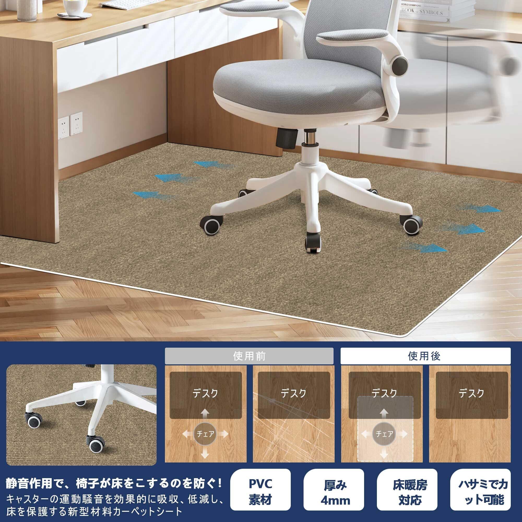【ノイズリダクション床 保護マット】厚さ4ミリの吸音ノイズキャンセリング椅子クッションがキャスターの運働による騒音を低減し、静かで快適な環境を作り出します。椅子やキャスターが引っ掛かりません。段差を気にせず、移動もスムーズ。 使う場所や用途に合わせて自由にカットでき、使用便利です、新築や賃貸マンションに適しています。