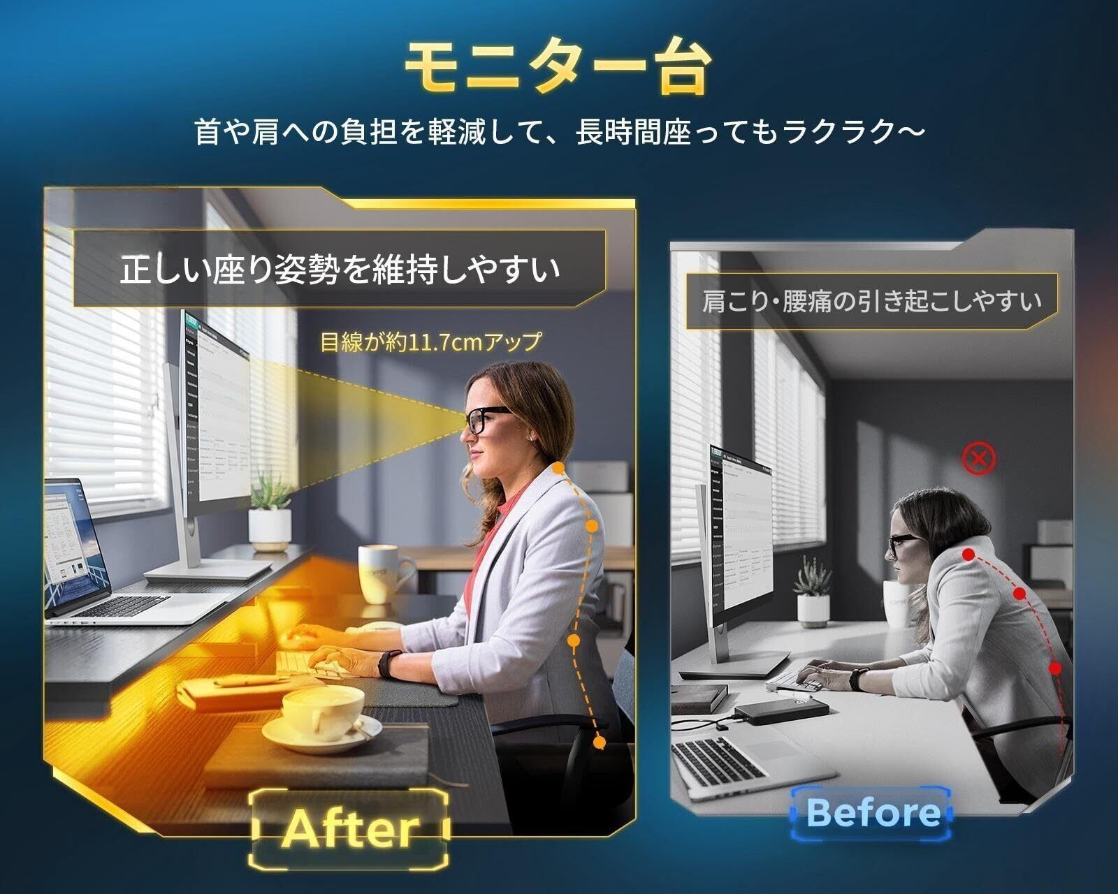 【モニター台付き、卓上の使用面積を広げる】目線が約11.7cm高くなり、背筋が伸びて自然と美しい姿勢に導き、首や肩への負担も軽くなる。モニター台は収納空間も作り出し、卓上の勤務スペースを解放し、デスクが広く使える。作業と収納のエリアを明確に区切り、席に座っているままで欲しいものがサッと手に入れ、作業効率が大幅にアップ。