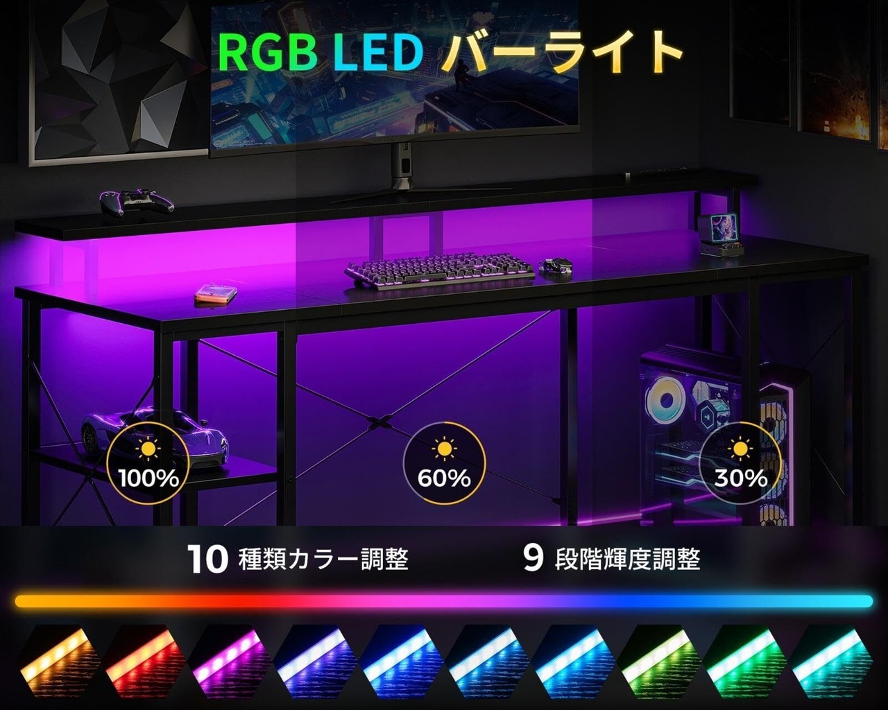 【RGBバーライト付き、お部屋の雰囲気が変わる】ゲーム机には10段階調色・9段階調光のLEDバーライトを搭載しており、気分やシーンに合わせてカラーを切り替えることができる。頑丈で長持ちやすい。臨場感にあふれるゲーム雰囲気だけではなく、温かみのある学習・仕事環境も作り出せる。