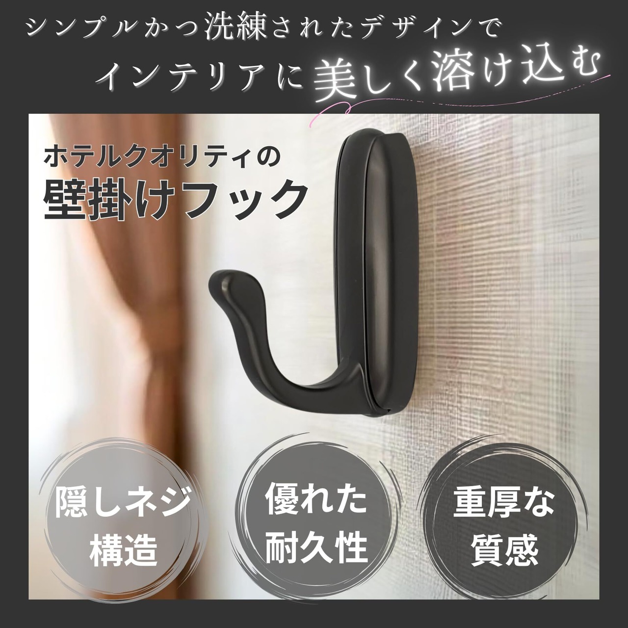 【取り付けネジが見えない隠し構造】 ネジ隠し機構を採用し、取り付け部分が見えないスマートなデザインを実現。シンプルかつ洗練されたウォールハンガーとして、空間を美しく整えます。金属製の収納フックならではの高級感が、インテリアに上品なアクセントを加えます。
