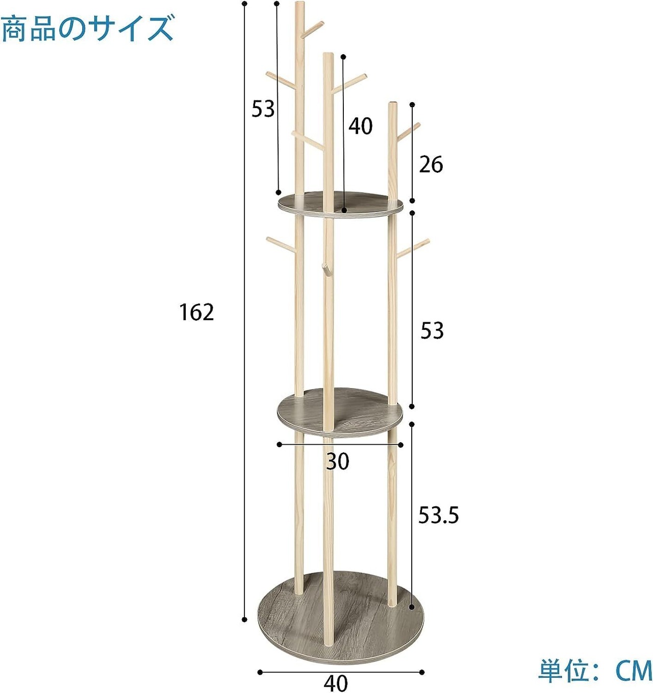 【多機能収納】木製ポールハンガーサイズは40奥行き x 40幅 x 162高さ cm。木製ポールハンガーには、9個のフック、3段の物置が含まれます。コート、衣類、バッグ、スカーフ、帽子などを収納できます。