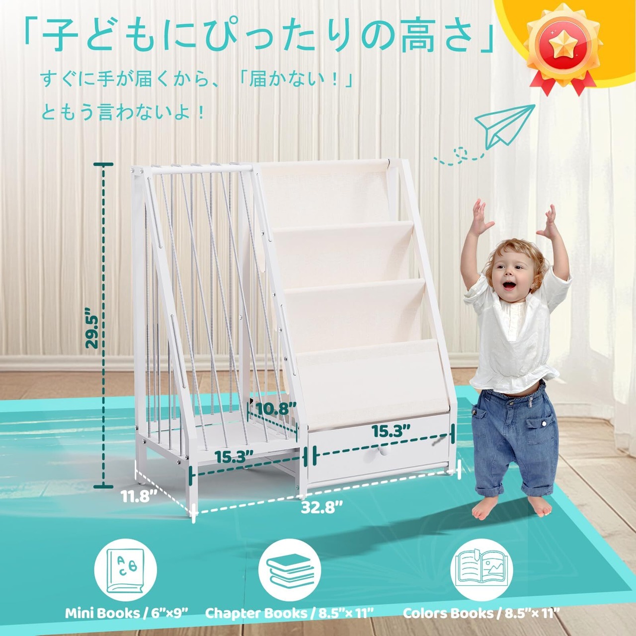 【ミニキッズ本棚で可能性を解き放とう】 おもちゃと本を整理するデザインで、散らかりを好奇心に変える子供用本棚。幼児が数秒で本を取り出せるように設計された本棚です。アクションフィギュアやレゴなどの小さなお宝を収納する引き出し付き。コンパクトサイズ(33.5インチ×12インチ×30インチ)のキッズ本棚は隅にぴったり収まりながら、たくさんのおもちゃ、パズル、ぬいぐるみを収納できます。