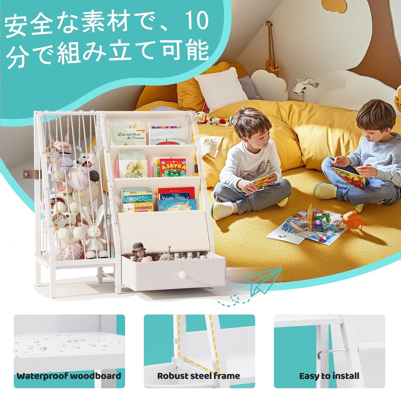【簡単セットアップのキッズ用本棚】 箱を開けて、10分で完成。工具付属、ストレスのない組み立て。ジュースをこぼしても拭くだけ。落書きしても消せる。私たちは親の苦労を理解し、誰でも簡単に使えるように設計しました。