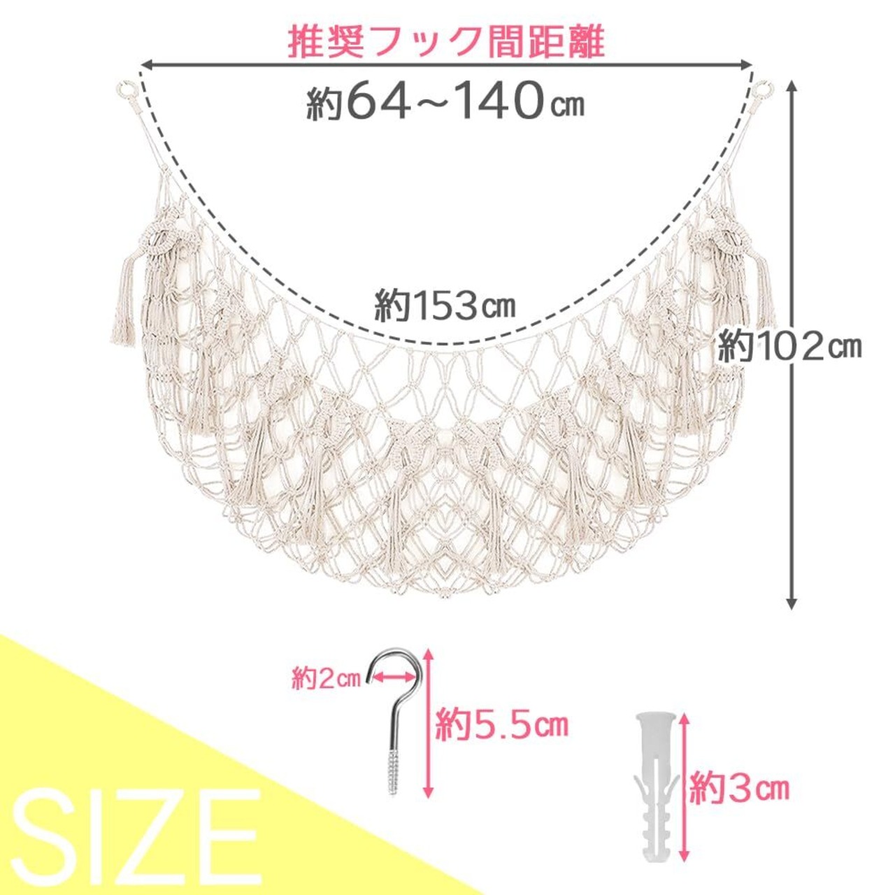 【セット内容】ハンモック×1点 フックネジ×3点 アンカー×3本 【サイズ(約)】153cm×102cm フック間隔:64cm~140cm 【カラー】ナチュラル 【材質】コットン