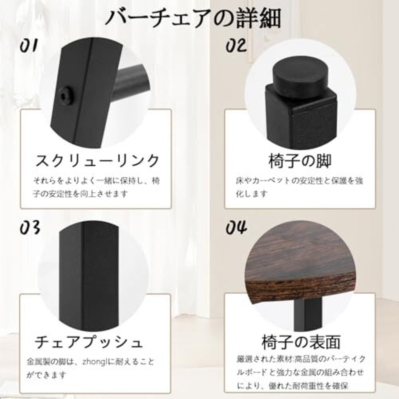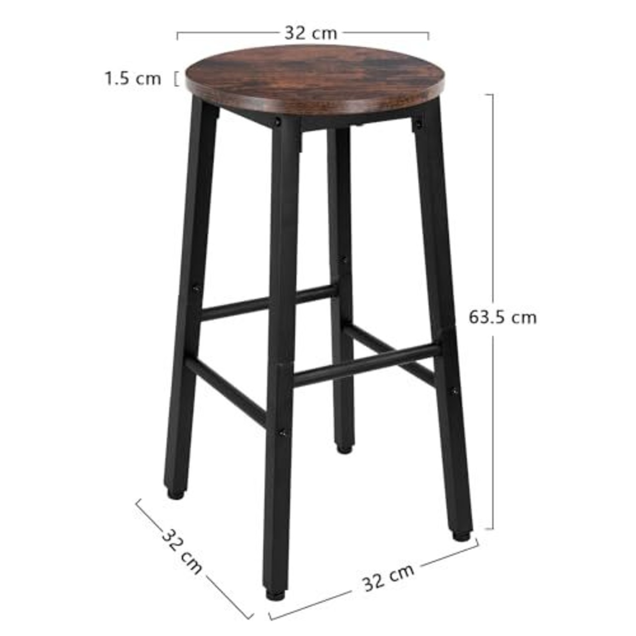 1.サイズ:幅32cm×奥行32cm×高さ63.5cm、材質:フレーム/スチール(粉体塗装)、座面/合成樹脂化粧繊維板(PVC)。こちらの商品は脚パーツ・座面・貫棒をお客様の方で組付けていただく「組立商品」となります。