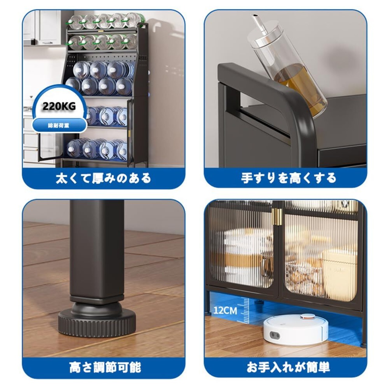 【優れた製造】:食器棚 キャスター付き、は厳選された炭素鋼と磁気性ドアを採用し、表面は焼付塗装を3層施し、8つの抗酸化処理で錆や汚れを防止します。大胆で厚みがあり、耐荷重性が高く、強い圧力下でも変形せず、安定して揺れません。 従来の竹製キャビネットに比べ、安定性と耐久性に優れ、傷つきにくいのが特徴です。四方密閉設計、防塵・防鼠丨密閉収納。直径5.0cmのプラグイン穴、ほとんどのプラグを通すことができます。バックパネルを取り外す必要はありません。食器棚の脚は2種類もあり、360°回転できるキャスターと高さ微調整脚を場合によってお使いいただけます。調整脚は組み立てができて揺れを感じたら、4つの脚とも回して高さを微調整して、4つの脚を全部地面にピッタリ立てば、たとえ平たいでない地面でも揺れなく使用できます。
