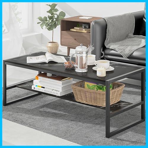 ローテーブル 幅100奥行45高さ38cm センターテーブル リビング 机 座卓 コンパクトデザイン 収納棚板の高さ可動式 床傷防止用のアジャストフェルト付き 強度安定 錆び防止 耐摩耗性 防水性 耐熱性機能 大理石調目天板 (MBK, 100)