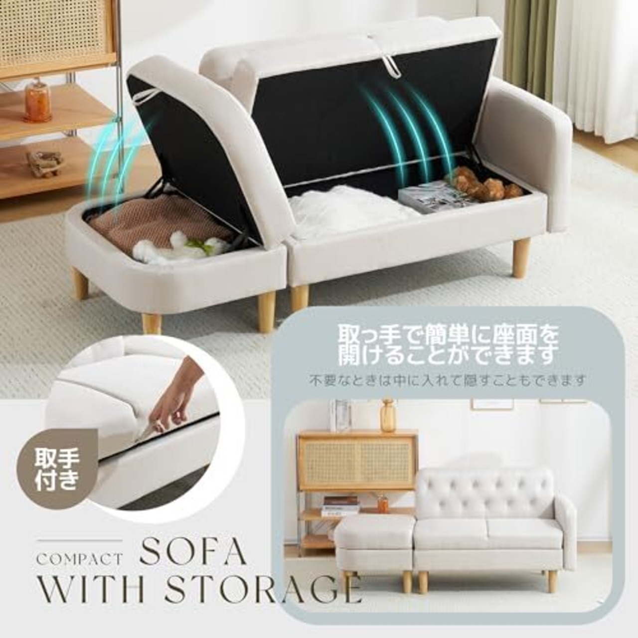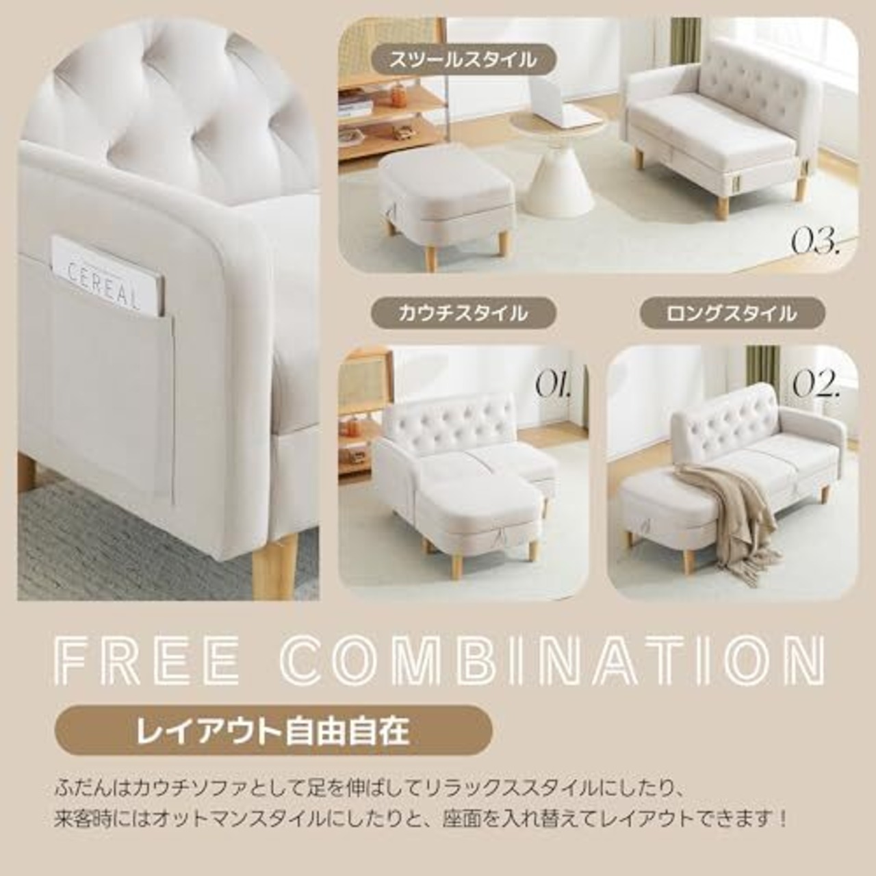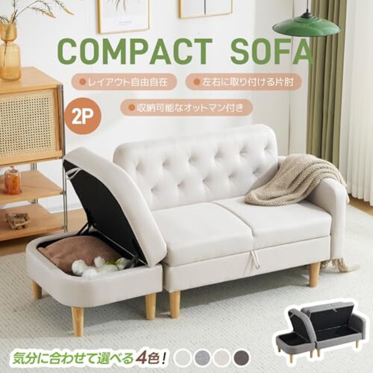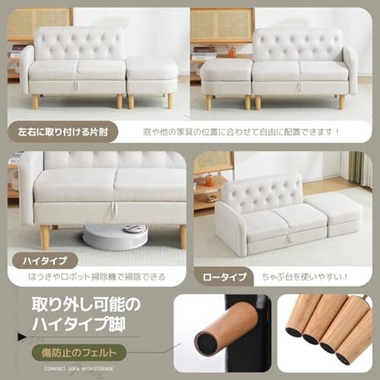 商品仕様 素材:クッション材:ウレタンフォーム、ウェービングベルト、シリコンフィル 張り材:ポリエステル 構造部材:木材 脚:ブナ カラー:ダークブルー、ライトグレー、ベージュ サイズ:二人掛けソファー:101*72*82cm(肘掛け、木脚を含み) オットマン:48*72*42cm(木脚を含み) 重量(N*W):32KGS 重量(G*W):30.5 KGS サイズ:92*71*52cm 組立品/完成品:組立品(肘掛け、脚のみ) おすすめのポイント: 1. たくさん収納できるソファーとオットマン 2. 背部までスッキリとした外観。 3. 取り外し可能の木脚付き、脚なしで利用可能 4. 左右に取り付けられる肘掛 5. 座席は弾力性、座り心地に優れた高品質のスポンジを採用 6. 自由自在に組み合わせ たくさん収納収納スペース付き ソファー,オットマンとも収納スペースついています。布団、オモチャなどの生活用品を簡単に収納できます。肘掛けにも収納袋付き、雑誌、スマホやリモコンなどの小物を収納できます。ワンルームのような狭い部屋の収納空間は大幅に上昇します。 ブナ無垢材の木脚付き、脚なしで利用可能 取り外し可能なブナ材製の木脚付き、女子一人でも簡単に組み立てられます。脚なしでも利用可能なので、ご都合によりご利用いただけます。 左右側とも取り付けるアームレスト 左右どちら側も肘掛を固定できる位置を設けますので左右どちら側も肘掛けを取り付けられます。 座り心はよい座席 座席は高品質のスポンジを採用され、弾力性、座り心に優れています。ちょうどいい硬めで安定性もあります。長く座ってもお体の負担になりません。座席の張地は100%ポリエステルなので柔らかくて肌に優しいです。毛玉もなりにきぃです。 高さ15㎝の木脚付き 木脚の長さは15㎝なのでほとんどのロボット掃除機は対応できます。ソファー座面下の掃除は楽です。木脚なしで利用の場合には、床から1.5㎝の高さです。 自由自在に組み合わせ セパレート式のオットマンなのでレイアウトを変更したい場合にはオットマンを移動だけで完成。 ご注意: ※お客様組み立て品となります。 ※本商品の組み立てやご使用に際しては、乱暴に扱いますと破损やケガの原因となりますので、丁寧にお取り扱いください。 ※商品デザインは、品质に差し支えない程度に、予告なく変更する場合があります。 ※新しく入荷した商品は今まで贩売していた商品と色差がある場合がございます。 ※商品のデザインが写真と違う場合がございますが品質上の問題なく使えますのでご了承下さい。 ※必ず水平で、安定した場所に設置してください。