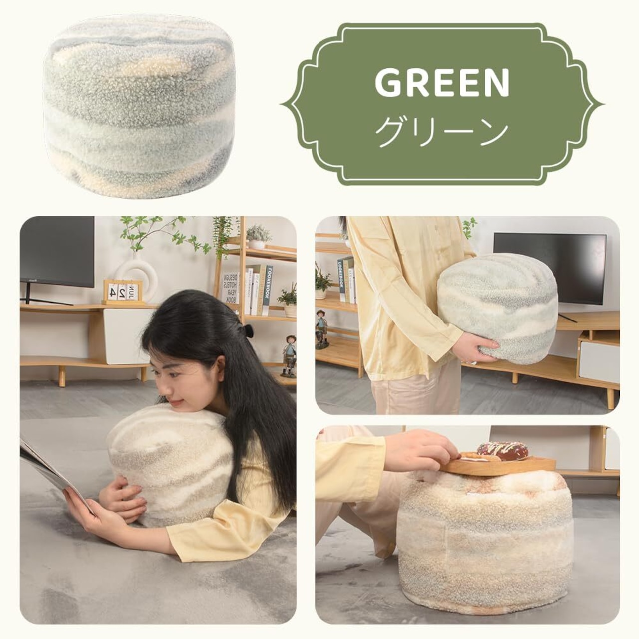 JEMAジェマ ビーズクッション クッション 小さめ フロアクッション スツールクッション ミニ 小さい おしゃれ かわいい コンパクト 圆柱形 へたりにくい コーデュロイ 人気 ギフト プレゼント 一人暮らし 軽い 軽量 クラデーション風 グリーン 30Rx18cm