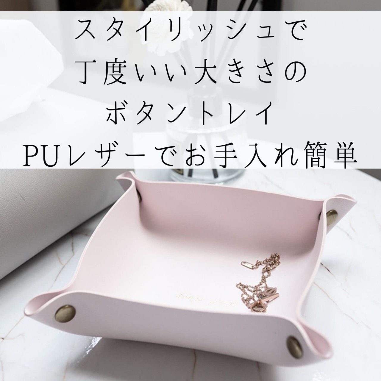 シンプルでおしゃれなボタントレー。PU素材でお手入れも簡単です。