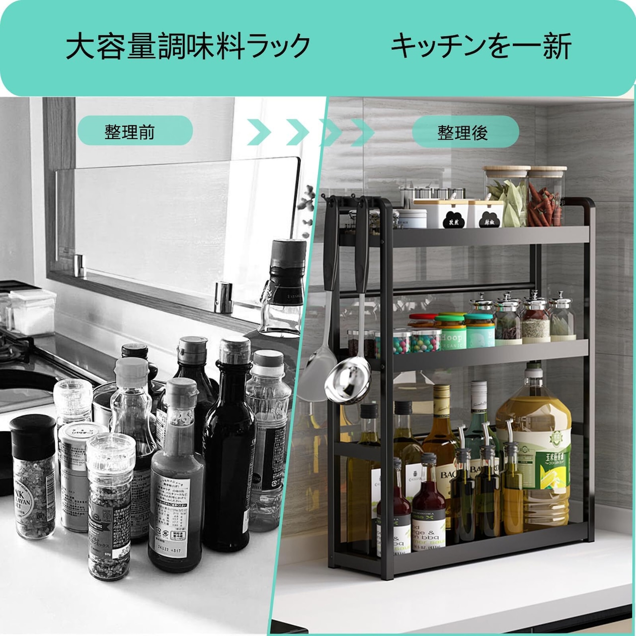 調味料ラック 多機能キッチン 収納スパイスラック卓上ラック大容量台所 収納ラック キッチンラック調味料棚(三段式) (3rd floor 14in, Black 黒)