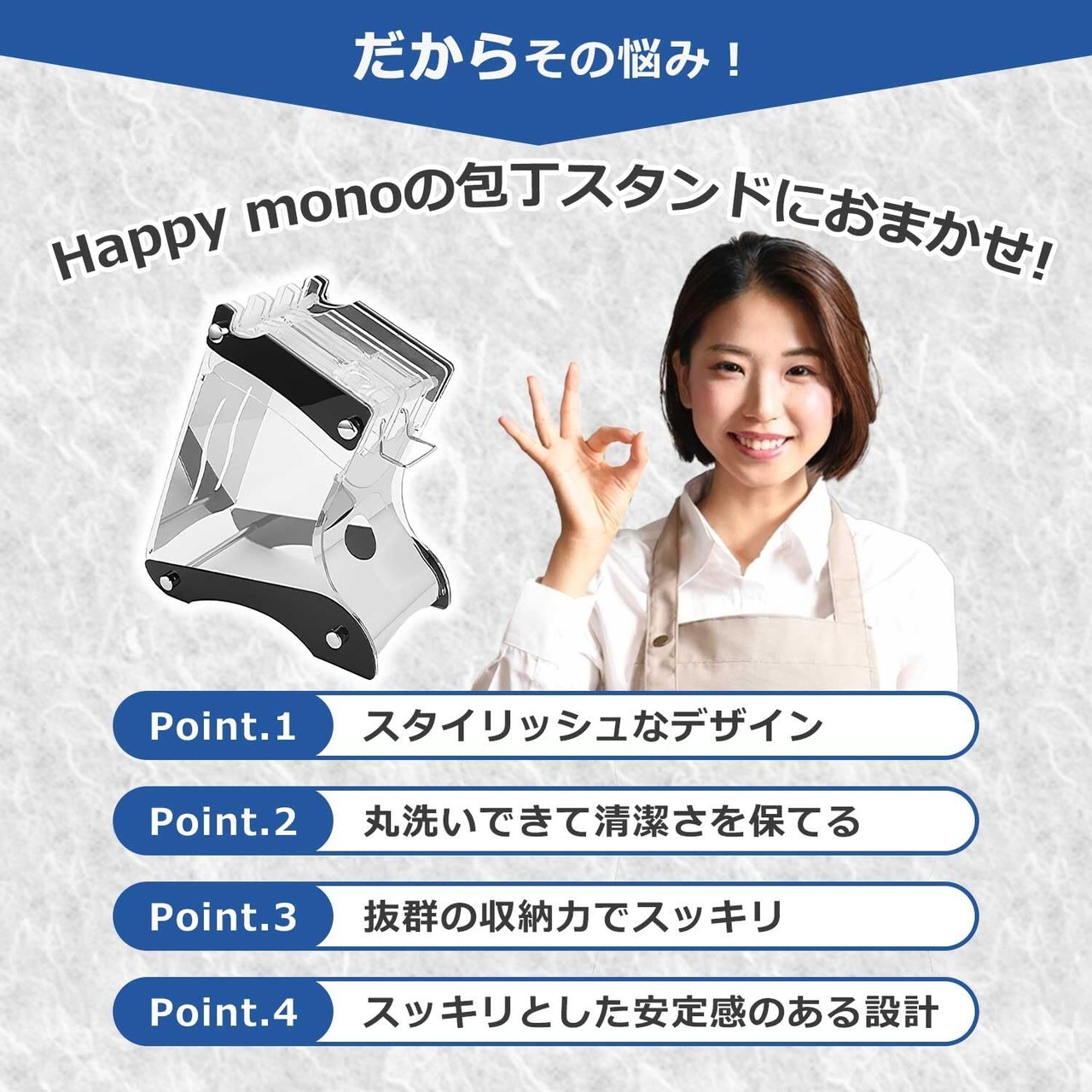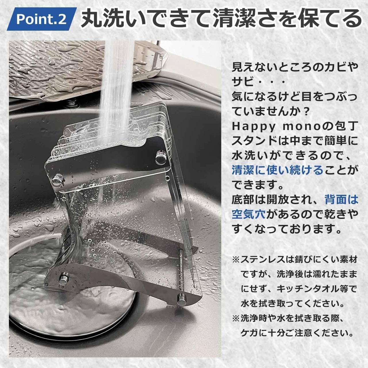 【Pinot2:丸洗いできて清潔さを保てる】見えないところのカビやサビ・・・ 気になるけど目をつぶっていませんか? Happy monoの包丁スタンドは中まで簡単に水洗いができるので、清潔に使い続けることができます。 底部は開放され、背面は空気穴があるので乾きやすくなっております。 ※ステンレスは錆びにくい素材ですが、洗浄後は濡れたままにせず、キッチンタオル等で水を拭き取ってください。 ※洗浄時や水を拭き取る際、ケガに十分ご注意ください。