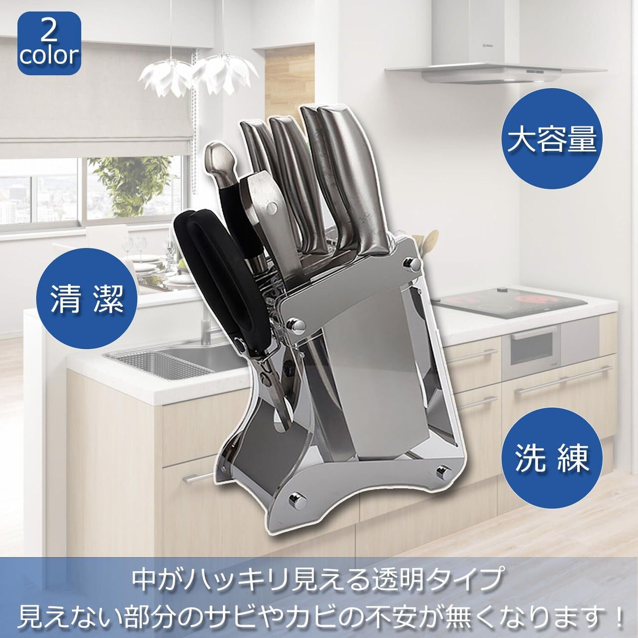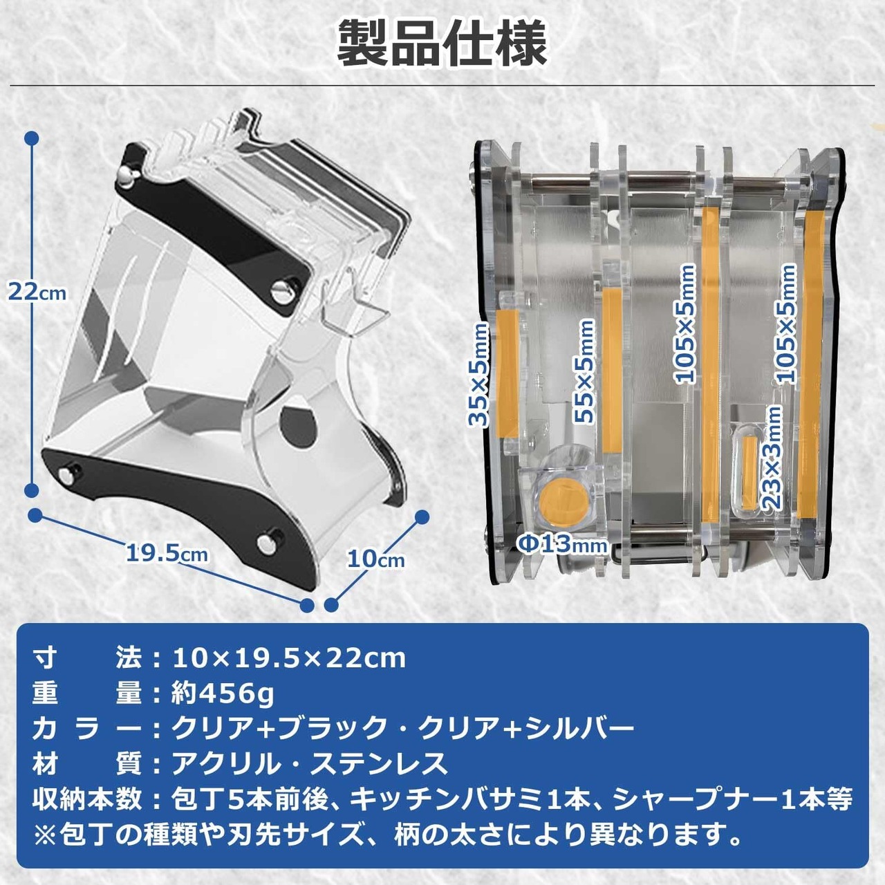 【製品仕様】寸法:10×19.5×22cm 重量:約456g カラー:クリア+ブラック・クリア+シルバー 材質:アクリル・ステンレス 収納本数:包丁5本前後、キッチンバサミ1本、シャープナー1本等 ※包丁の種類や刃先サイズ、柄の太さにより異なります。