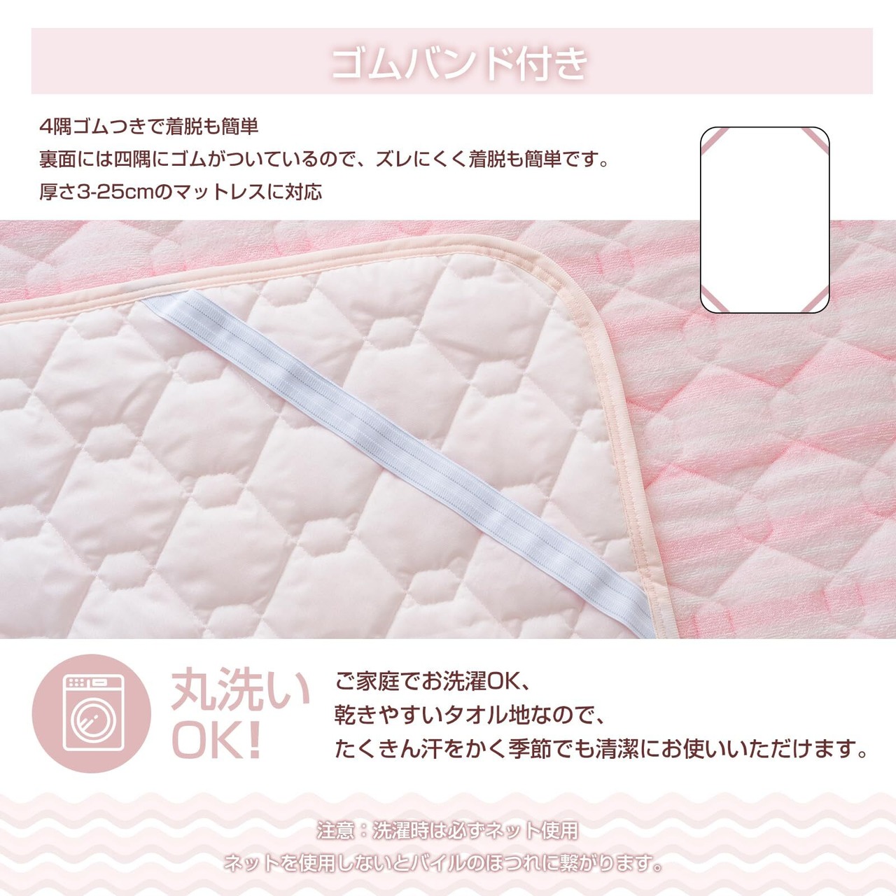 【オールシーズン向け&ゴムバンド付き】タオル生地は人体の皮膚の汗を吸着し、体温を迅速に正常に回復させ、本当に通気性、吸汗効果を達成し、肌に優しくで、四季の使用に適している。敷きパッドの四隅に滑り止めのゴムバンドが付いていて、敷きパッド をマットレスにしっかり固定できる。ゴムバンドを使用しているので、より美しくなる。お洗濯の際の取り外し&取り付けも簡単なので、使いやすくて、家事の負担も軽減してくれる。