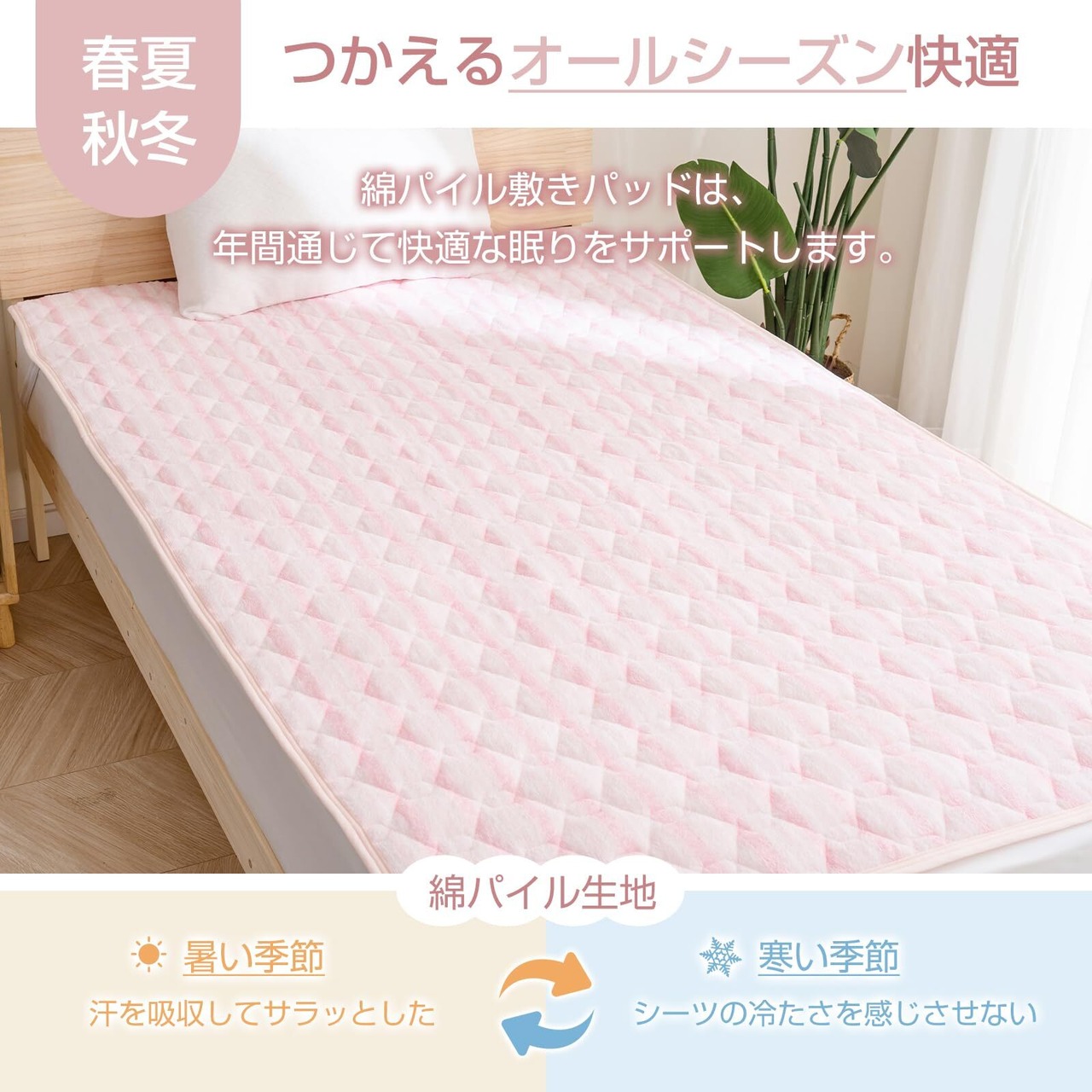 【タオル生地を使用・綿100%のパイル】タオル生地を使用しています。お肌に触れるパイル部分は吸水性の良い綿100%なので吸汗性に優れ、柔らかい肌触りためオールシーズンに最適な敷きパッドです。通気性に優れた生地を裏地として使用しているので、ガス交換や水分蒸発がより迅速になります。四季を通して使用しても蒸れることなく、とても爽やかです。