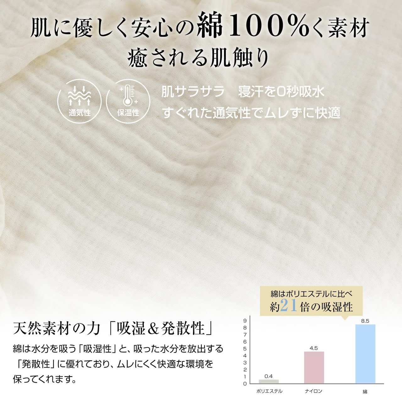 【天然綿100%素材·癒される肌触り】ガーゼを6枚重ねることで、贅沢な柔らかさと厚みを実感していただけます。また、パイルがないので、静電気も大変起きづらいのも人気です。