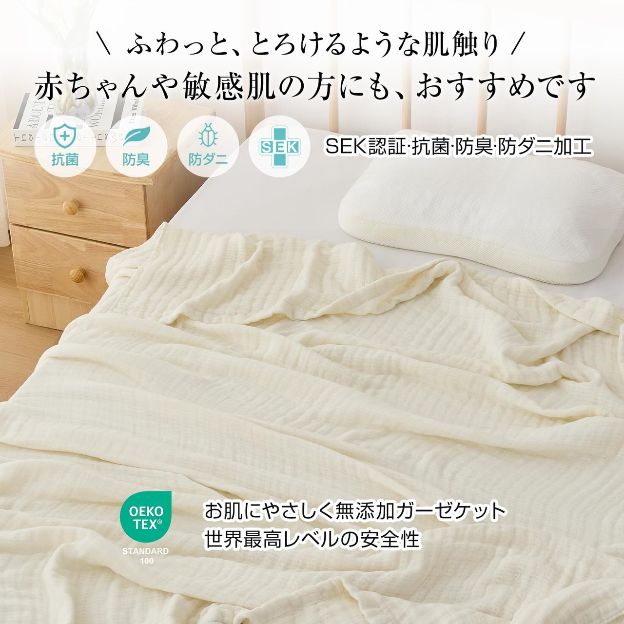 【在庫セール】fuwawa ガーゼケット シングル 6重織り 天然綿100% 吸湿 通気 綿 お昼寝ケット 肌掛け やわらか 夏快眠 肌に優しい 年中快適 丸洗いOK 抗菌・防臭・防ダニ 洗える 軽量 リバーシブル 冷房対策 ガーゼけっと 140x190cm (無地,アイボリー)