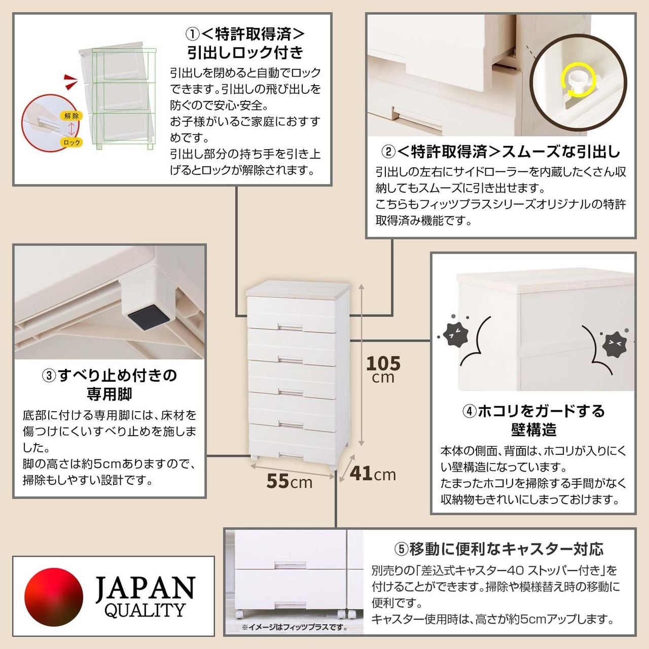 【特価セール】天馬(Tenma) 使いやすさを追求したお部屋になじむチェスト 日本製 完成品 フィッツプラスイージー 5段 取得済 引出しロック付きで抜け落ちを防ぐ スムーズな引出し 脚付き 木製天板 インテリアに合うリビングチェスト タンス 収納ケース 衣装ケース プラスチック 【組立不要】 【色 カプチーノ】 【サイズ FE5505】 【幅55×奥行41×高さ105cm】