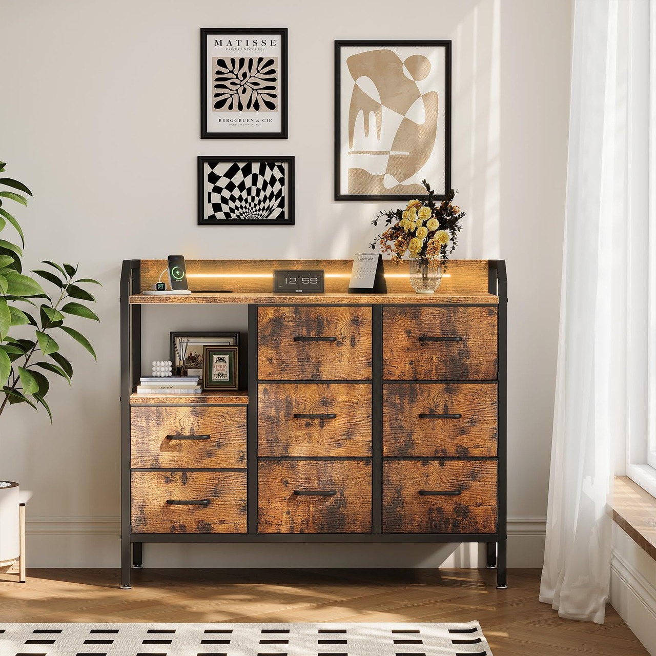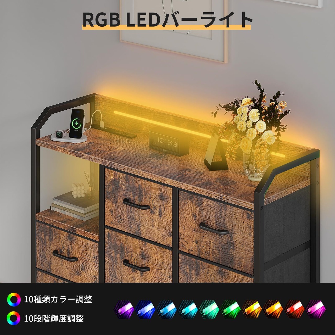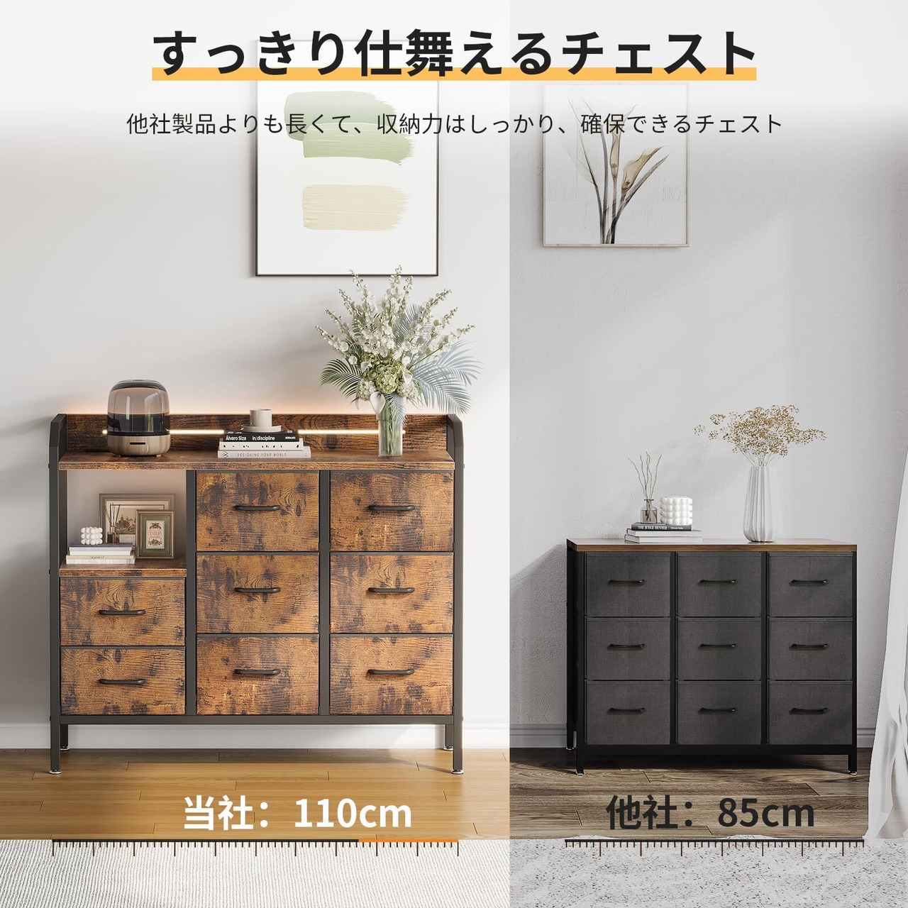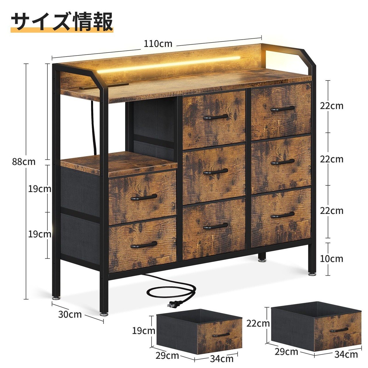 タンス チェスト 衣裝ケース 収納ケース 衣装棚 洋服収納 led付き 引き出し8杯付き コンセント付き 脱衣所 棚 衣類チェスト 洋服タンス 箪笥 たんす 木製天板付き 和風 リビング 安定感 大容量(ビンテージ, 幅110×奥行30×高さ88cm)