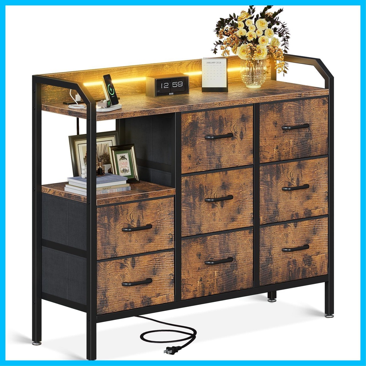 【数量限定】タンス チェスト 衣裝ケース 収納ケース 衣装棚 洋服収納 led付き 引き出し8杯付き コンセント付き 脱衣所 棚 衣類チェスト 洋服タンス 箪笥 たんす 木製天板付き 和風 リビング 安定感 大容量(ビンテージ, 幅110×奥行30×高さ88cm)