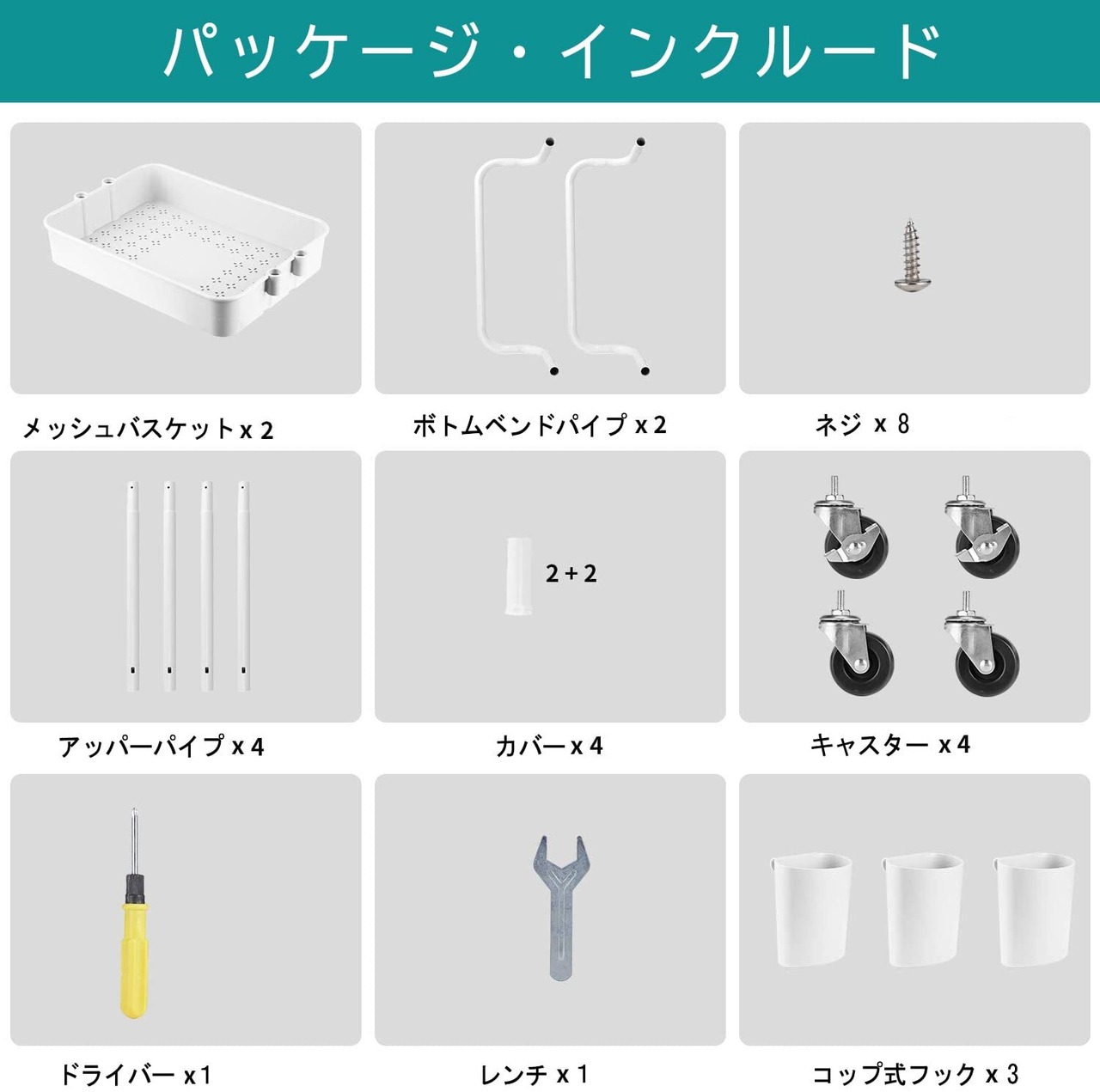 【大容量、強い耐荷重】:幅42×奥行35×高さ47cm 全体耐荷重:20kg。パッケージ内容:本体+キャスター×4+コップ式フック×3。カゴの縁に掛けるコップ式フック付属、キッチンツールやお箸などにも置けるし、洗面所で歯磨きやブラシなども置けるし、ほかのご使用方法もご検討ください。