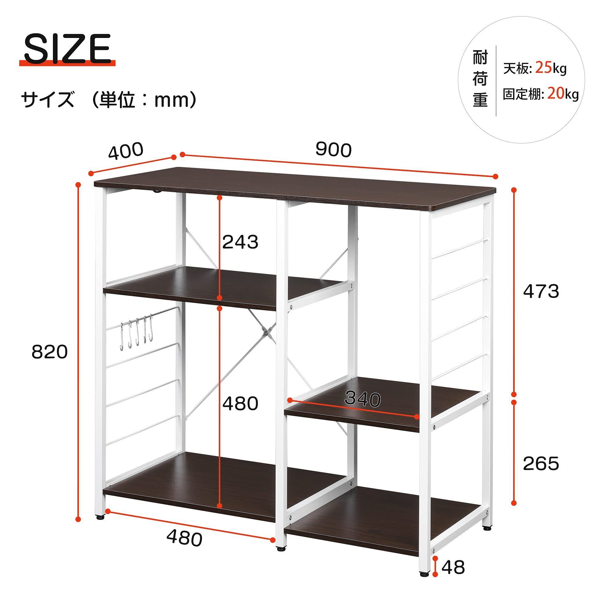 【商品仕様】商品外寸:幅900*奥行400*高さ820mm。本体重量:14.15KG。梱包重量:14.5KG。天板耐荷重:25KG。固定棚耐荷重:20KG。素材:合成樹脂強化合板(棚);スチール(フレーム)。※ご購入日より1年間保証期間中に、全ての品質上の問題とも弊社より全額返金、商品の取り替えを提供出来ますので、ご遠慮なくご連絡ください。
